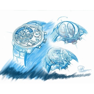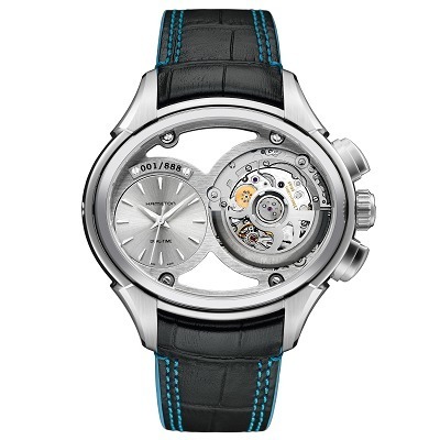 Stainless steel case, 53x44mm, ETA 2094 automatic chronograph movement, ETA 2671 automatic movement, sapphire crystal, 50m water resistance, black leather strap with blue lining and stitching. Limited edition of 888 pieces, MSRP 5,800 €.