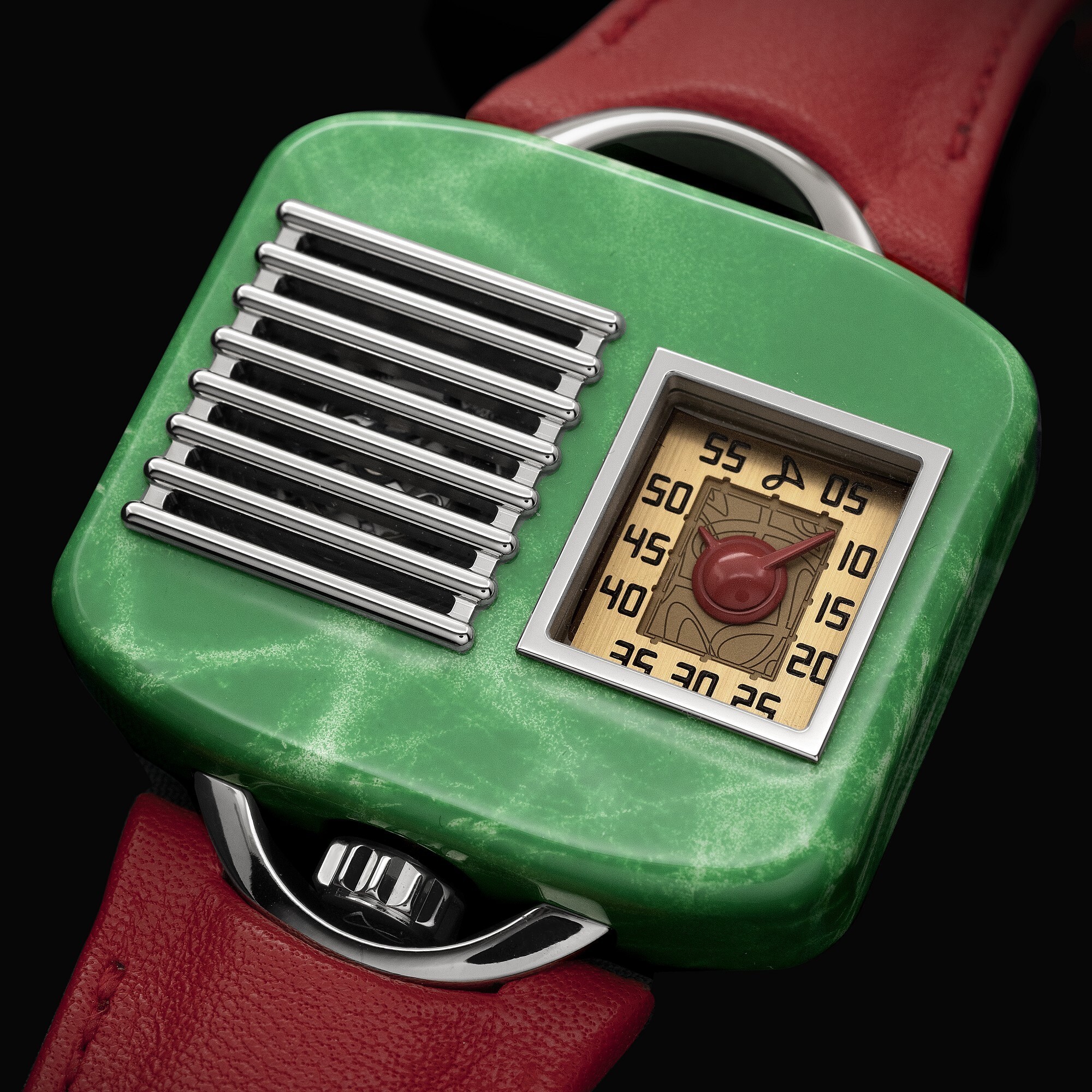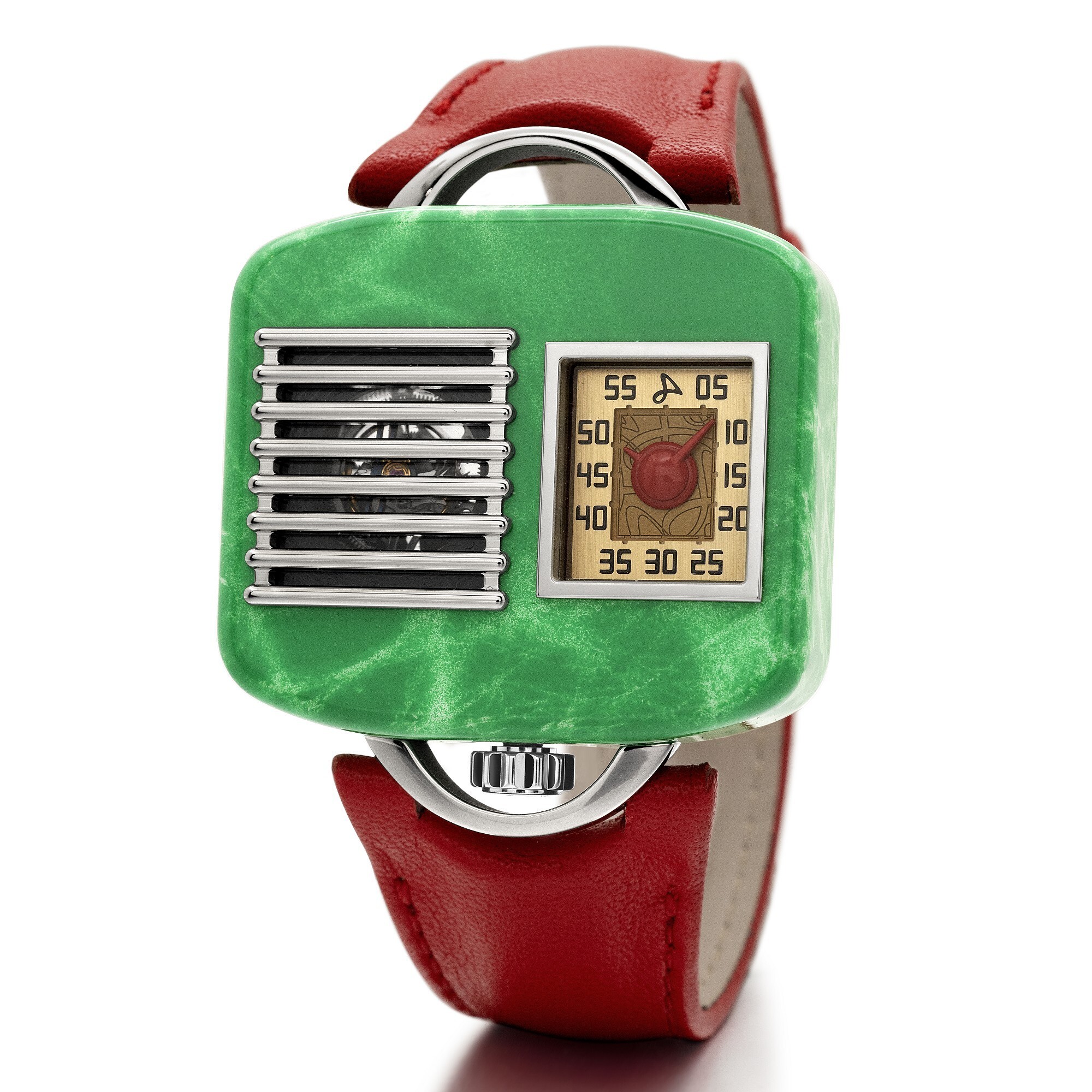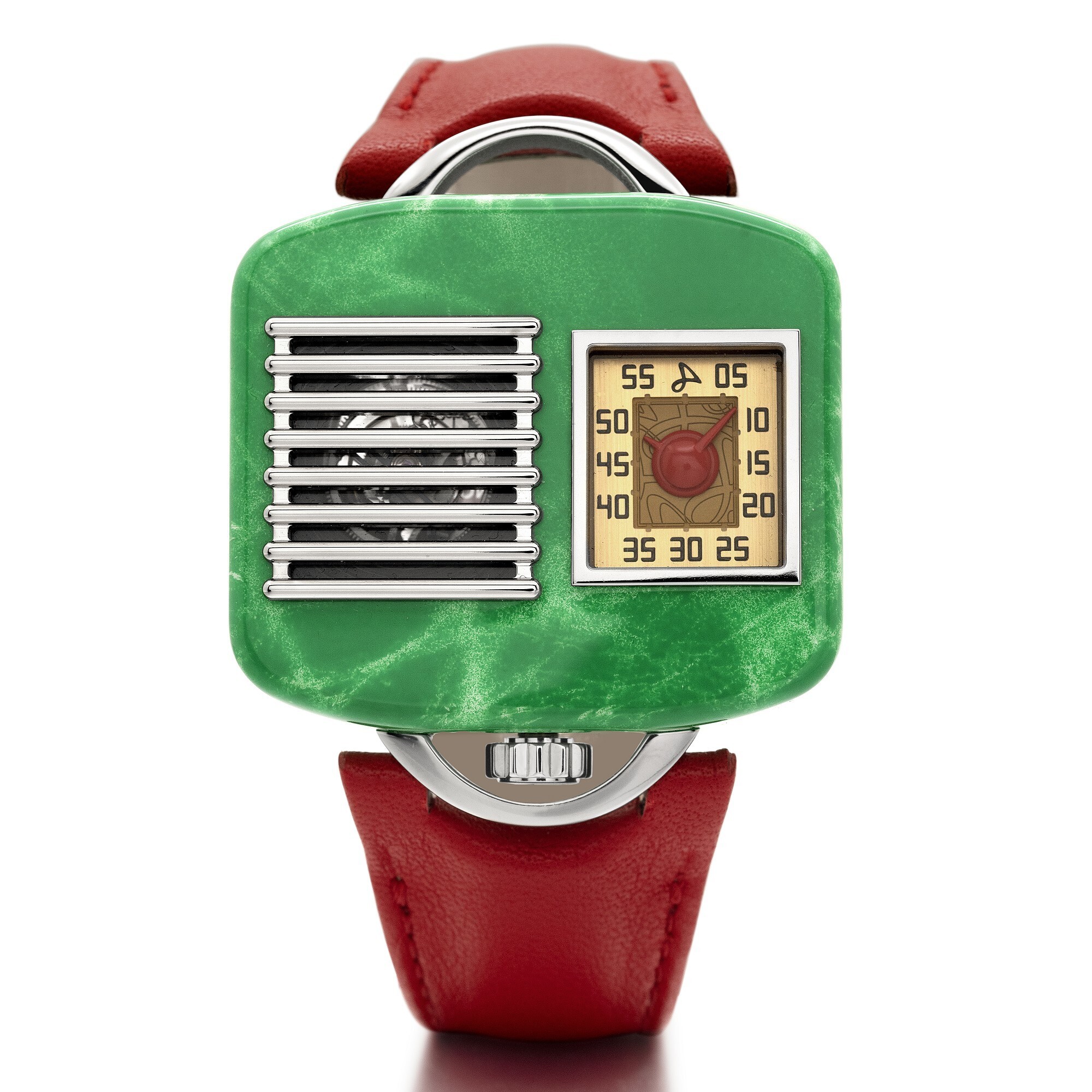 The watch draws its design inspiration from the “Model 5A5” radio launched in the 1940s by the Chicago-based General Television & Radio Corporation. The titanium case, hand-painted in green lacquer, vividly reproduces the look and texture of a bakelite radio cabinet, exuding a nostalgic vintage charm. The crown is positioned at 6 o’clock, while the lugs resemble radio handles, paired with a red leather strap for a bold contrast.