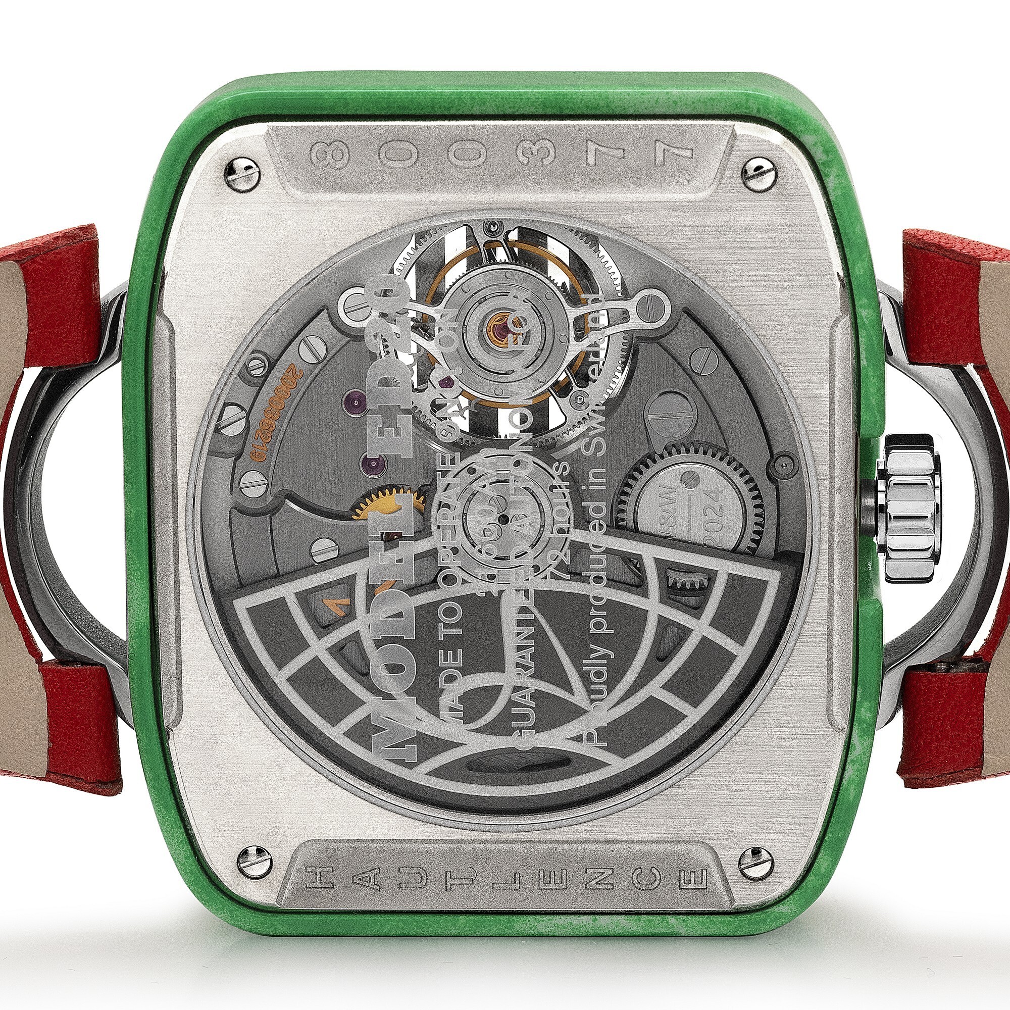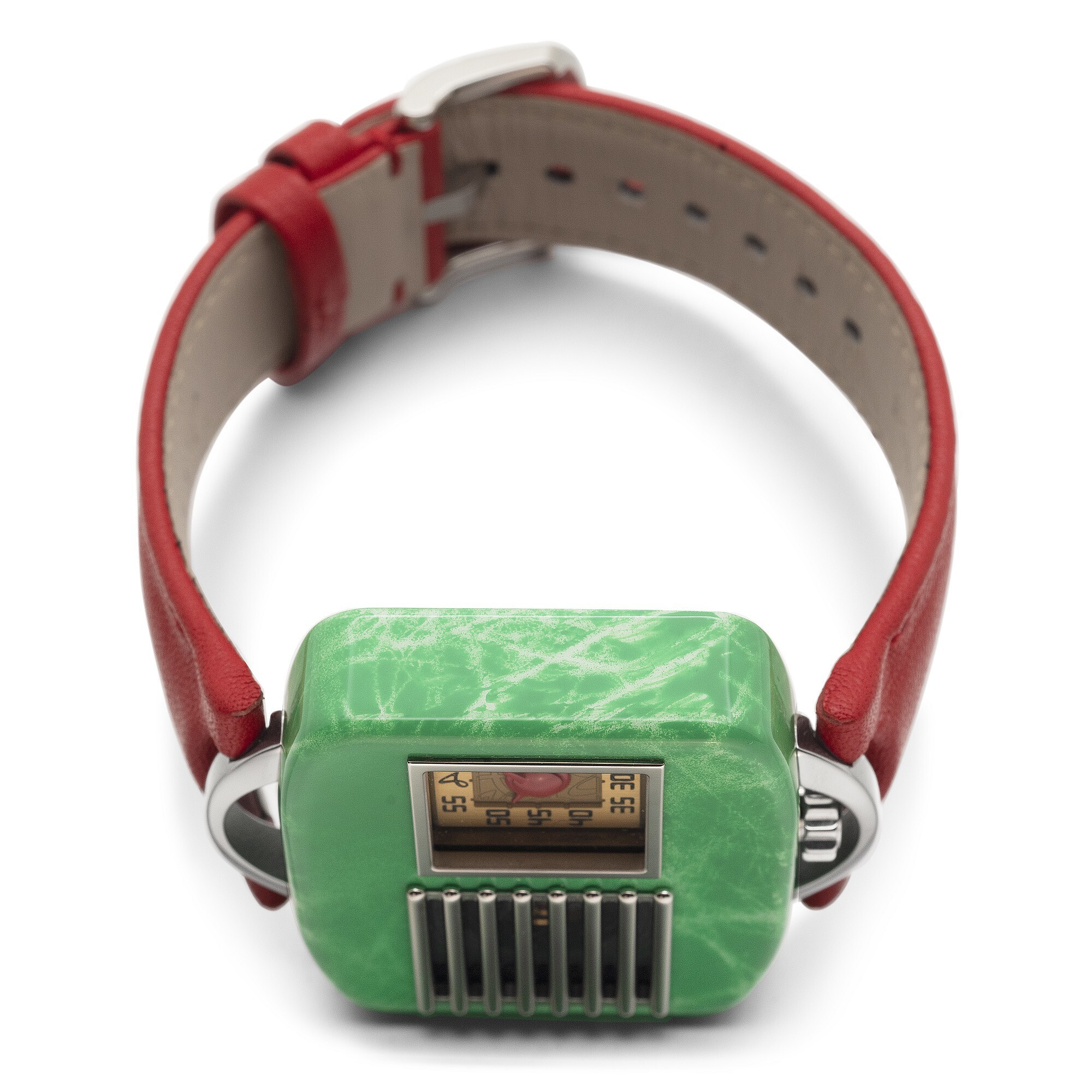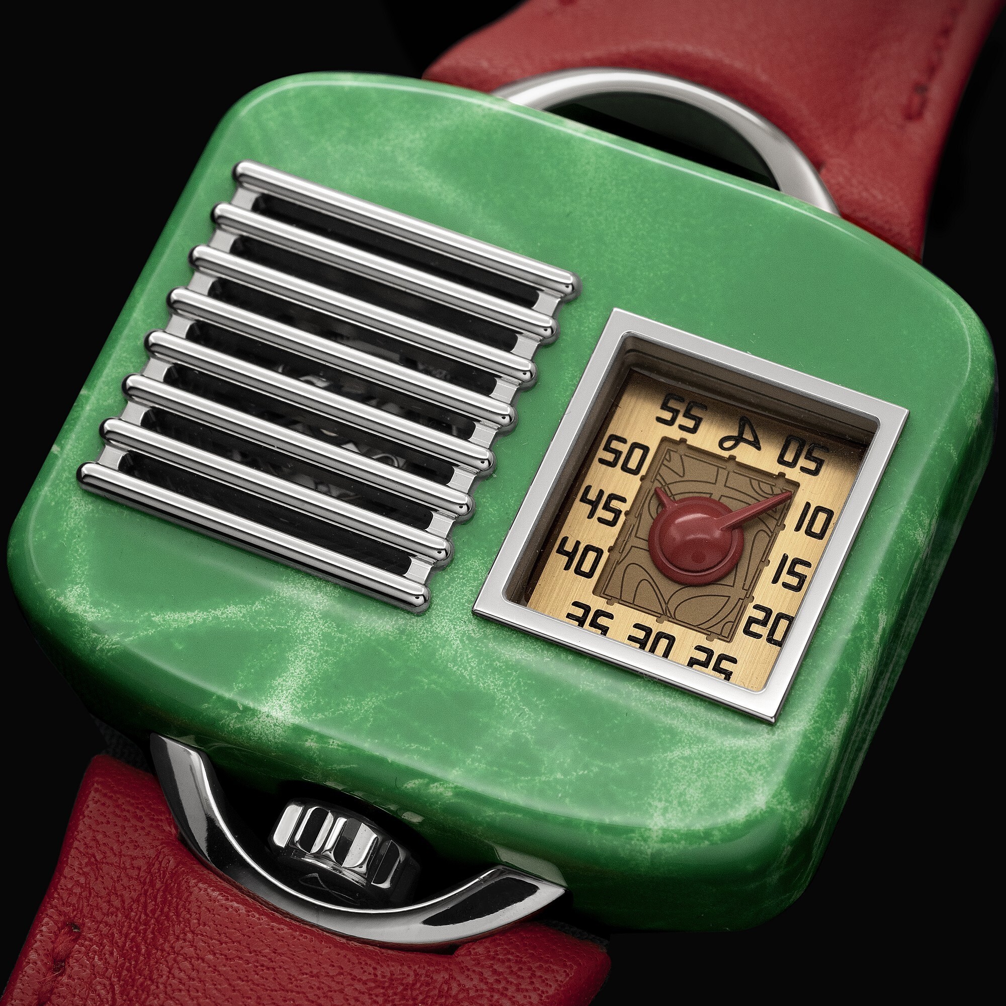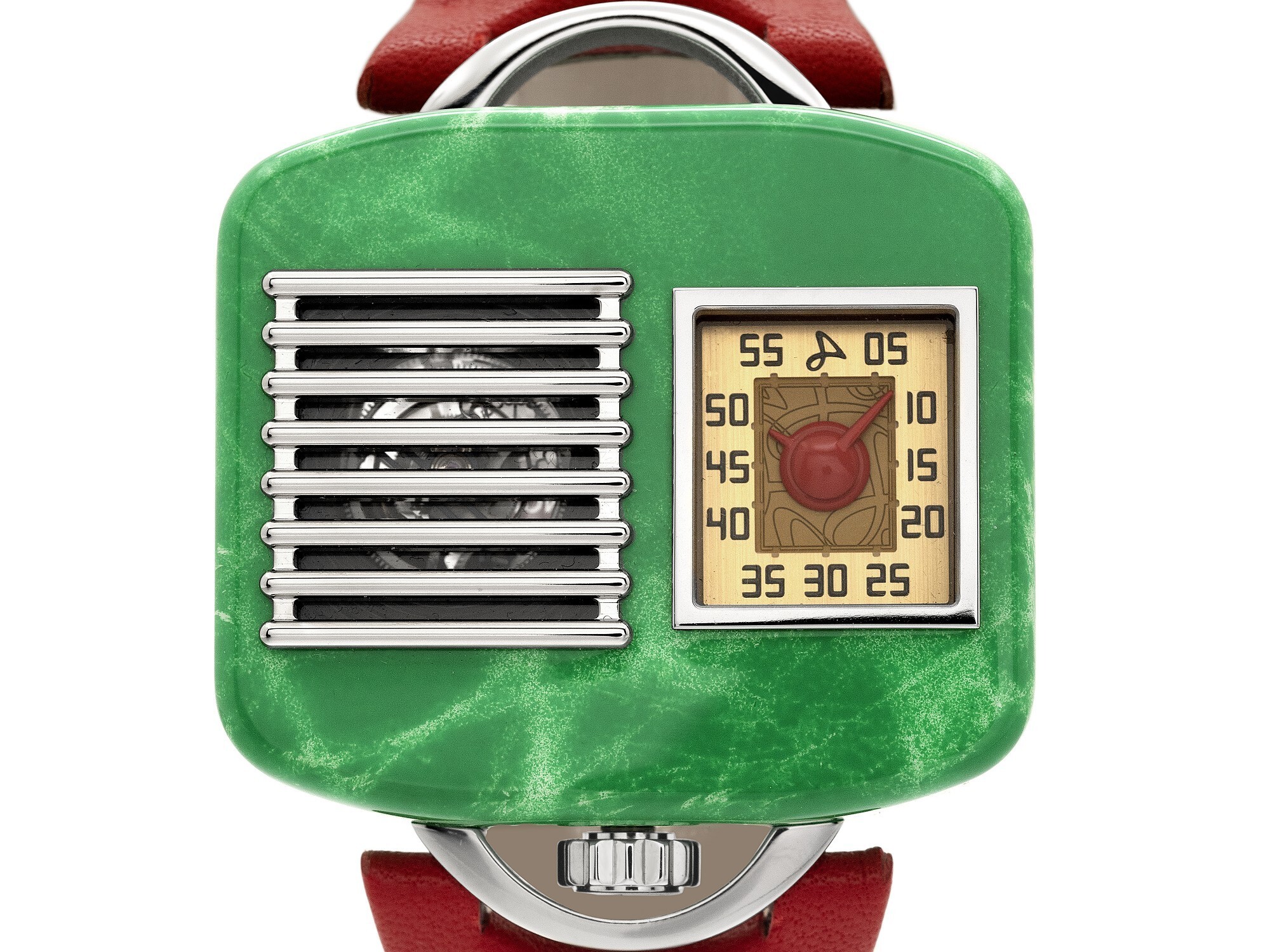 The watch draws its design inspiration from the “Model 5A5” radio launched in the 1940s by the Chicago-based General Television & Radio Corporation. The titanium case, hand-painted in green lacquer, vividly reproduces the look and texture of a bakelite radio cabinet, exuding a nostalgic vintage charm. The crown is positioned at 6 o’clock, while the lugs resemble radio handles, paired with a red leather strap for a bold contrast.