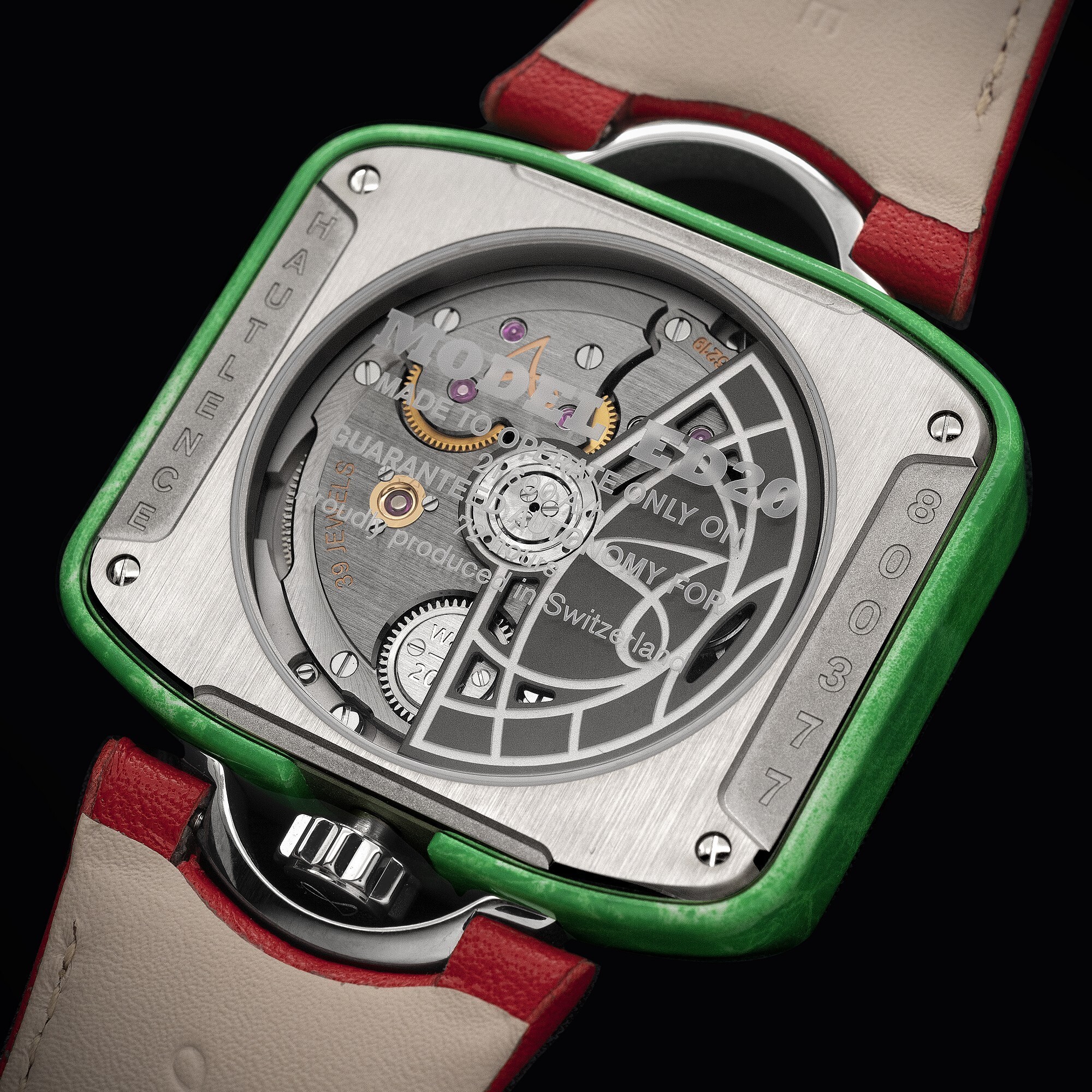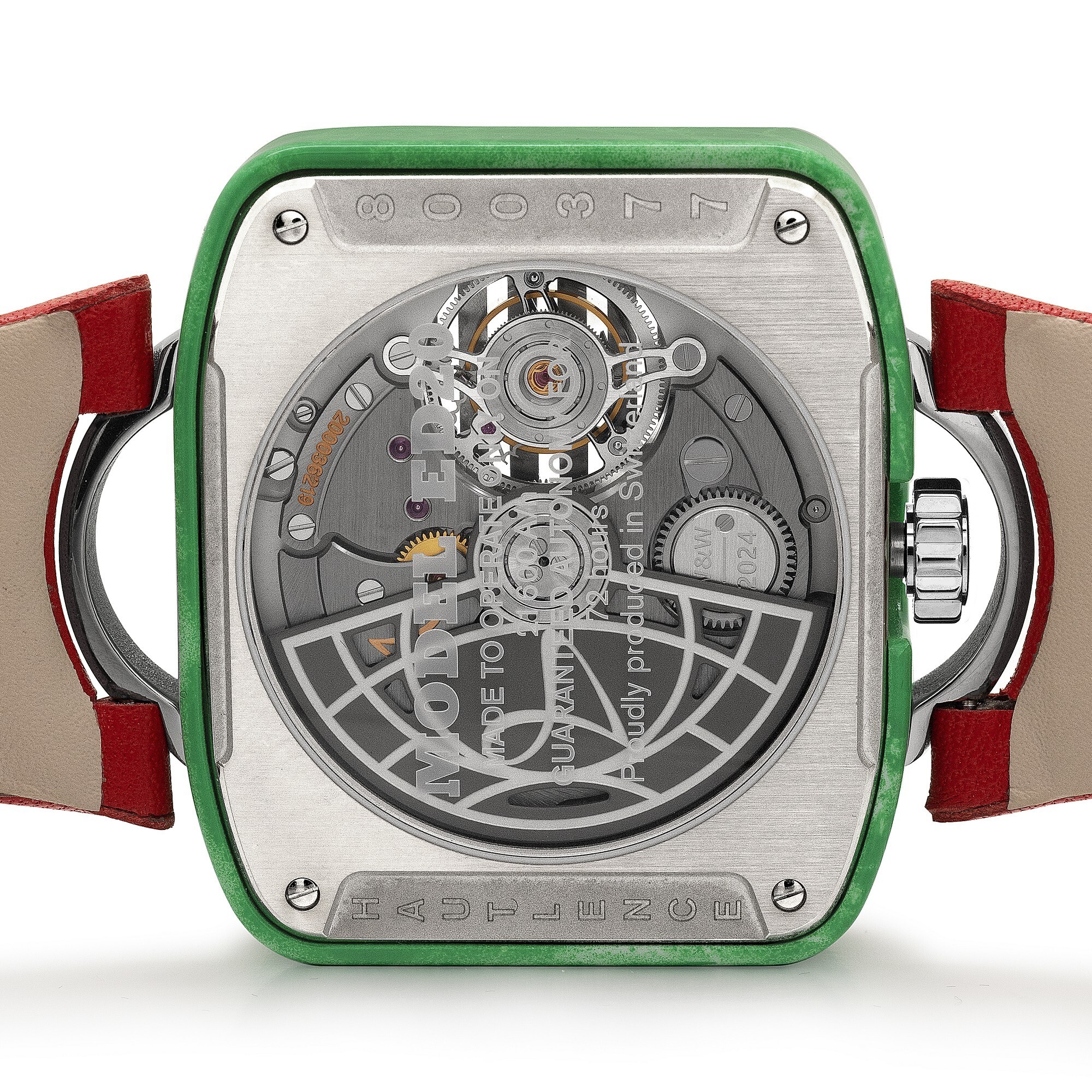 The watch is presented on a red calfskin leather strap, limited to 10 pieces worldwide, with a retail price of   €62,400.