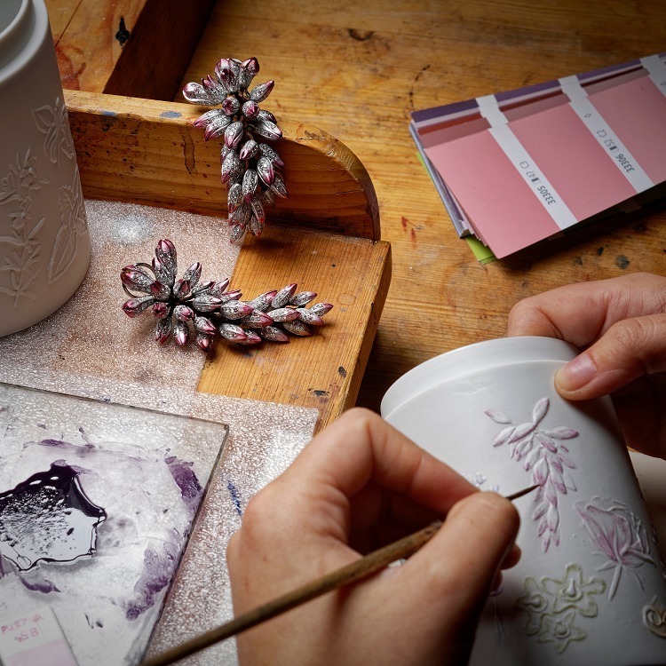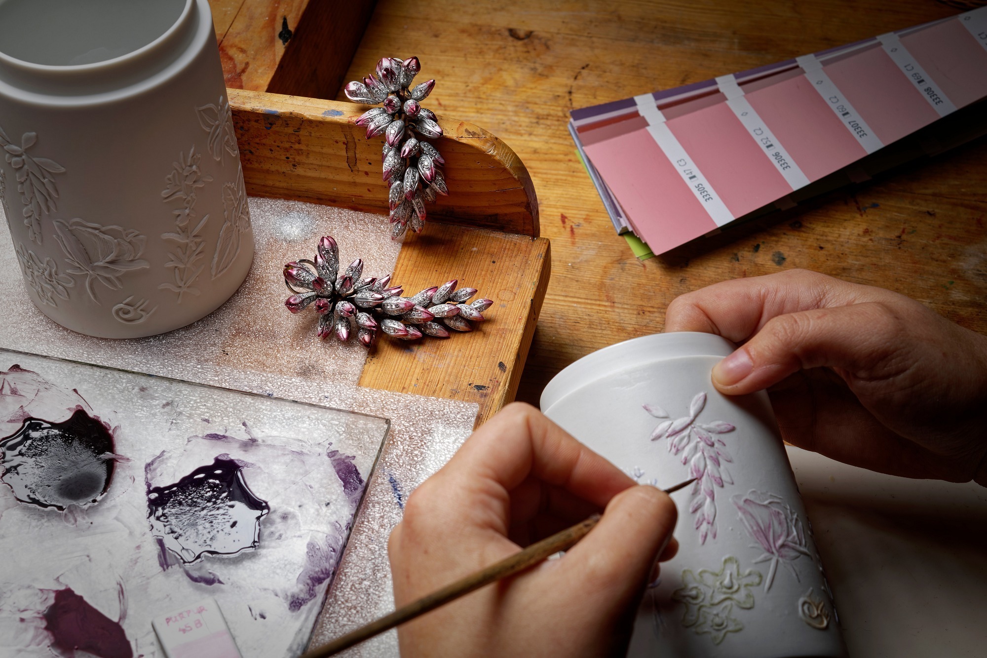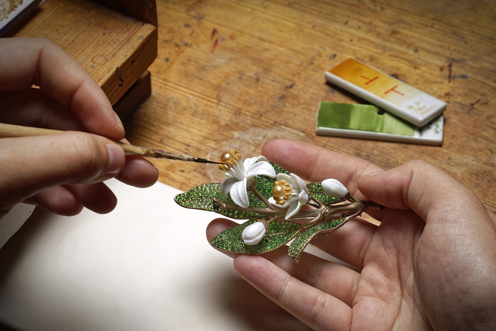 The Orange Blossom brooch resulted from a collaboration between Hemmerle and the German porcelain manufacturer Porzellan Manufaktur Nymphenburg. Pure white biscuit porcelain is used to craft the blooming petals, unopened buds, and slender filaments. A warm golden pearl sits at the flower’s heart, complemented by leaves densely set with demantoid garnets, imbuing the piece with natural vitality.