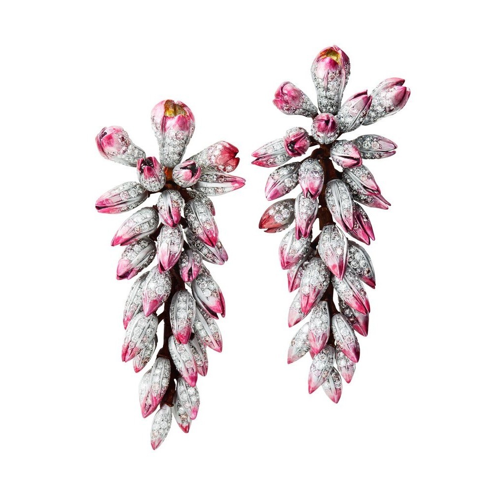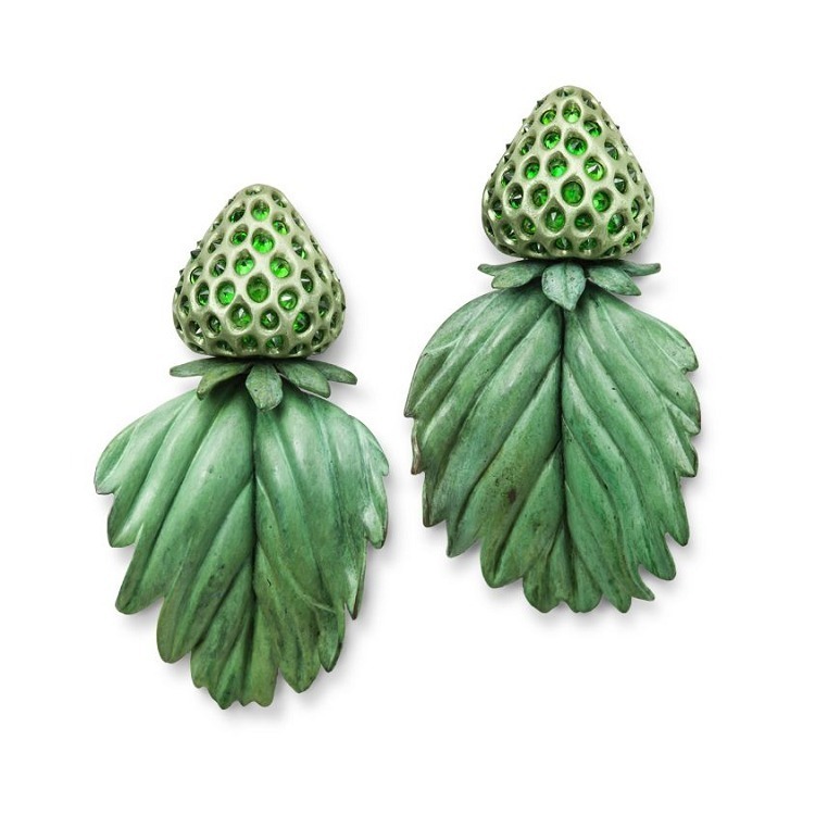 The gemstone selection for this series is particularly ingenious, featuring large pearls, fancy color diamonds, tanzanite, and more. It is worth noting that Hemmerle continues its signature technique of reverse-setting gemstones as a unique detail. For instance, in the Strawberry ear pendants, demantoid garnets are set upside down within the strawberry’s pores, resembling three-dimensional seeds and creating a striking visual impact.