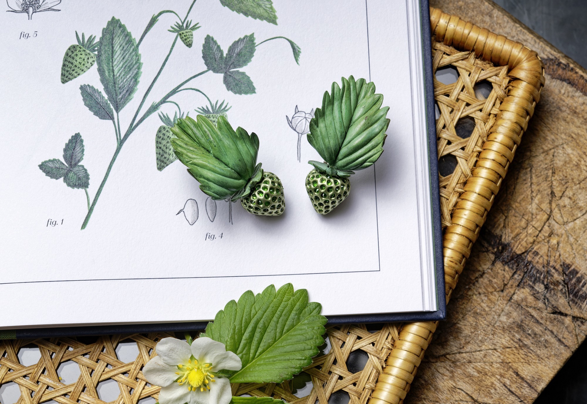 Hemmerle excels at trompe-l’œil-style expression. In this collection, “anodized aluminum” is used as the primary material, meticulously electroplated to faithfully reproduce the natural colors and unique textures of each plant. You can observe the pink-to-white gradient on ginger flower petals, the vibrant emerald green of strawberry leaves, and the slightly rough texture of orange blossom stems.