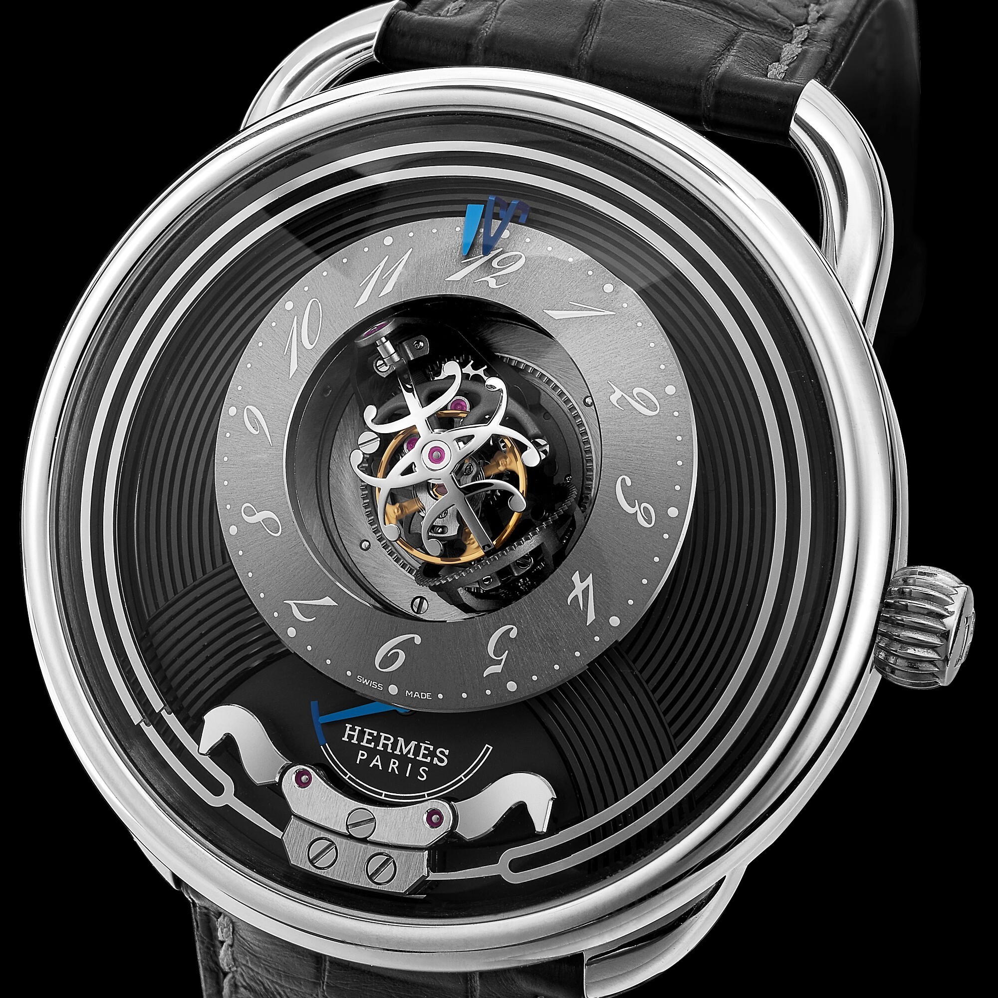 The 43mm titanium case features the signature Arceau stirrup-shaped lugs, rounded yet robust. The grey dial displays circular guilloché, with the hour and minute track finished in radial brushing and rhodium plating. Blue steel hands point to Hermès’ classic “running” numeral font. At 6 o’clock, a power reserve indicator is subtly positioned. The minute repeater hammers are visible on the dial and are shaped like two horse heads, paying tribute to Hermès’ equestrian heritage.