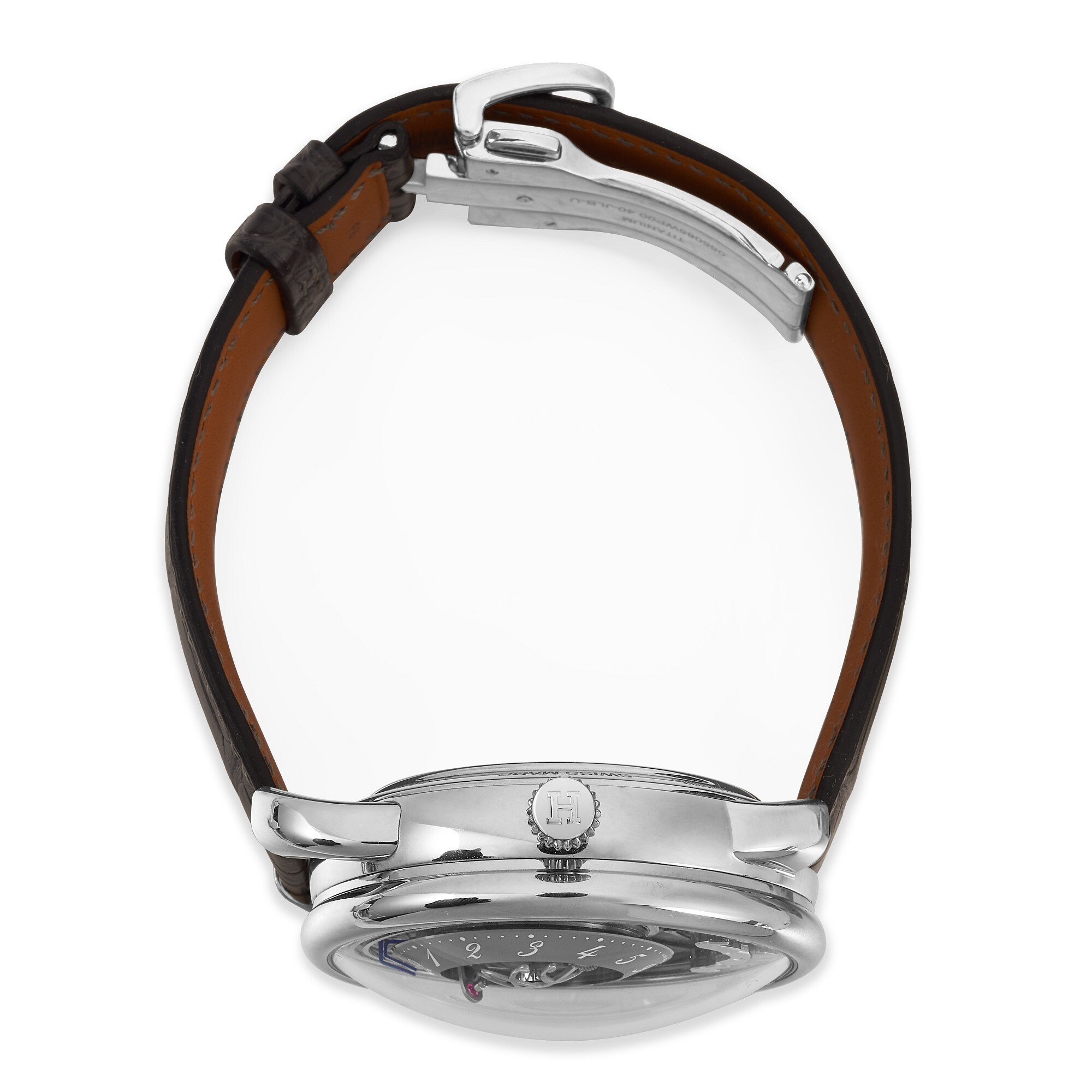 At the center of the dial sits the central three-axis 3D tourbillon, a first for Hermès. The tourbillon assembly weighs just 0.449 g and rotates on three axes: the innermost axis completes a rotation every 25 seconds, the middle axis every 60 seconds, and the outermost axis every 5 minutes. This multi-axis design counteracts gravity’s effect on the escapement while providing captivating mechanical motion. The interwoven “Double H” motif on the titanium tourbillon bridge is inspired by the wrought-iron decoration of the Hermès boutique on Rue du Faubourg Saint-Honoré in Paris.