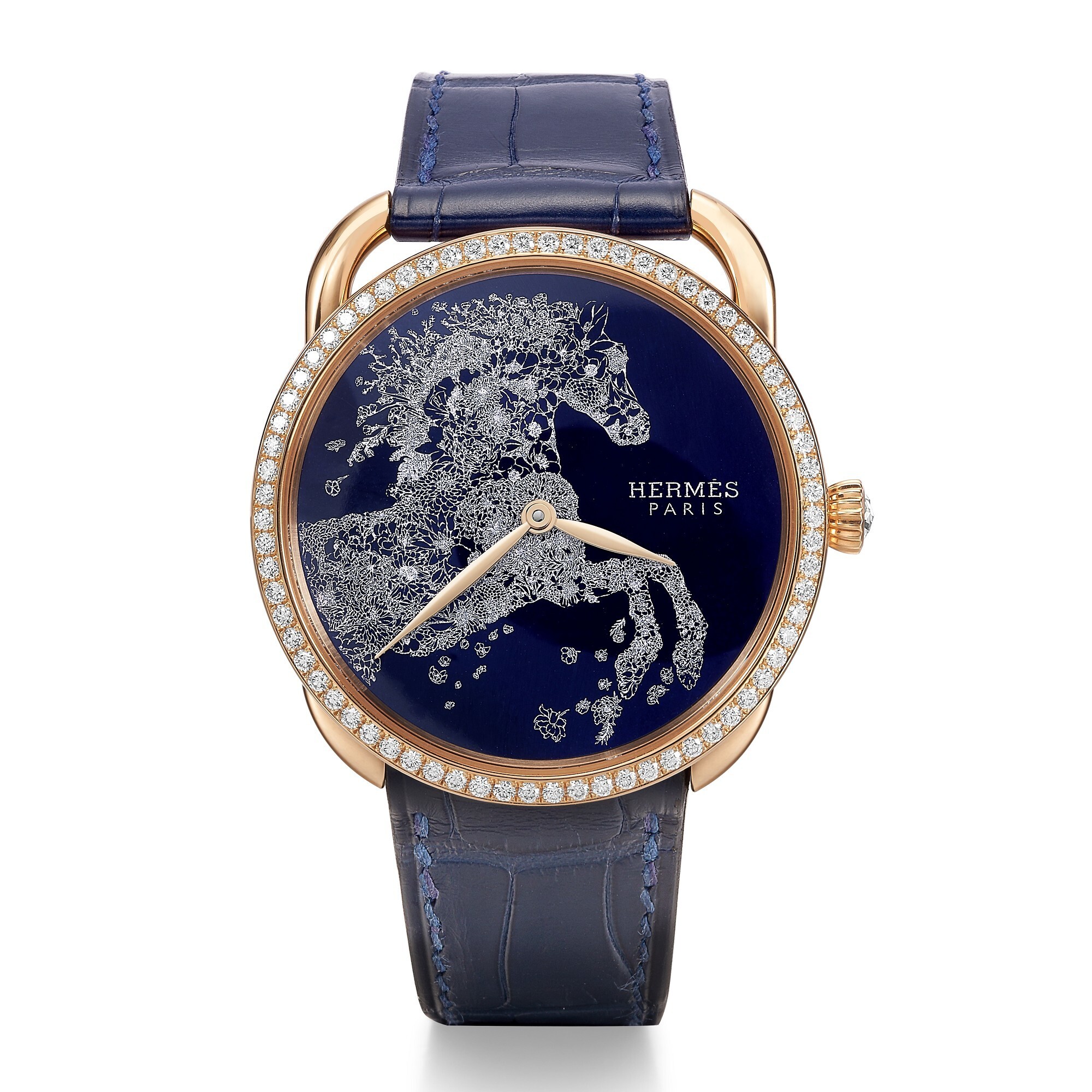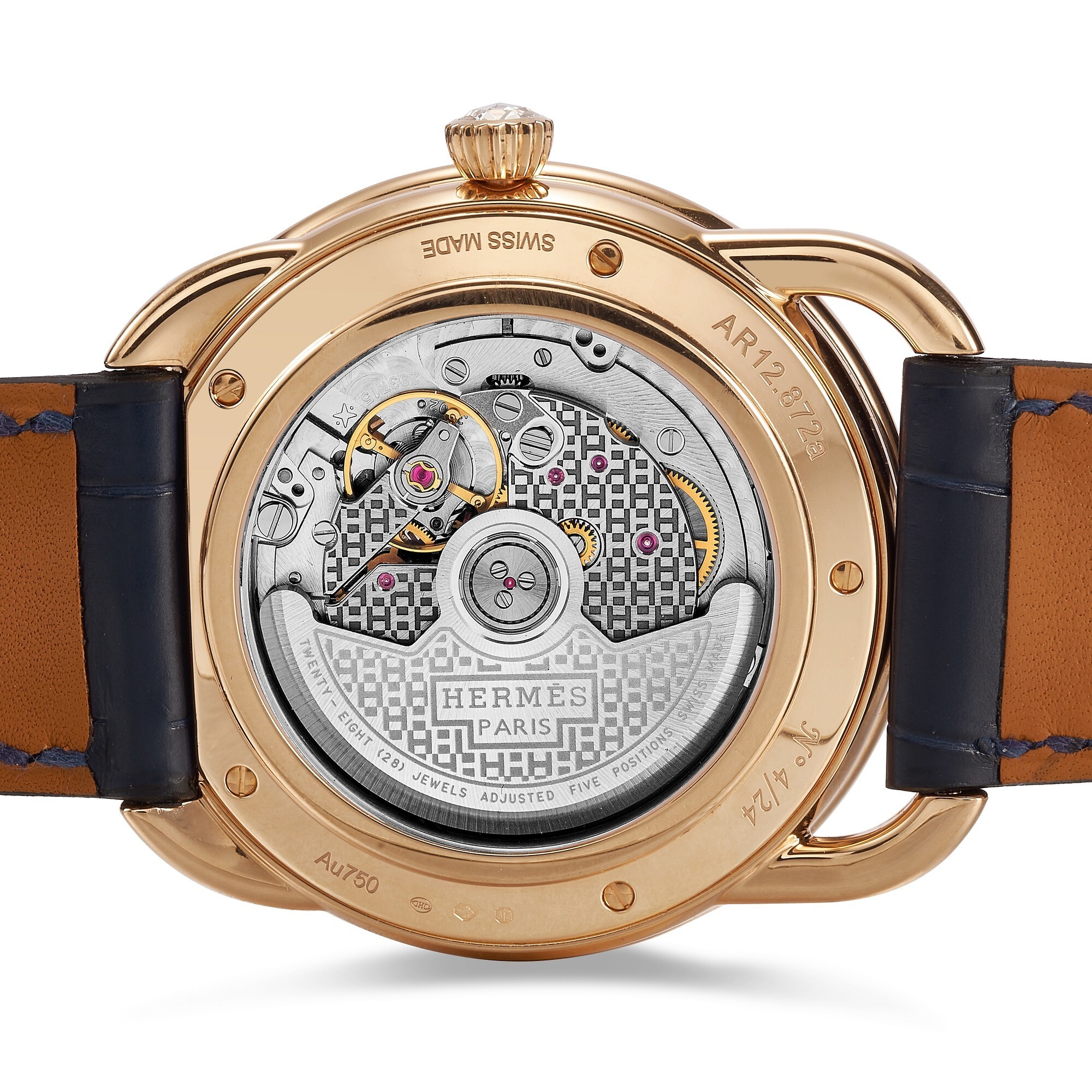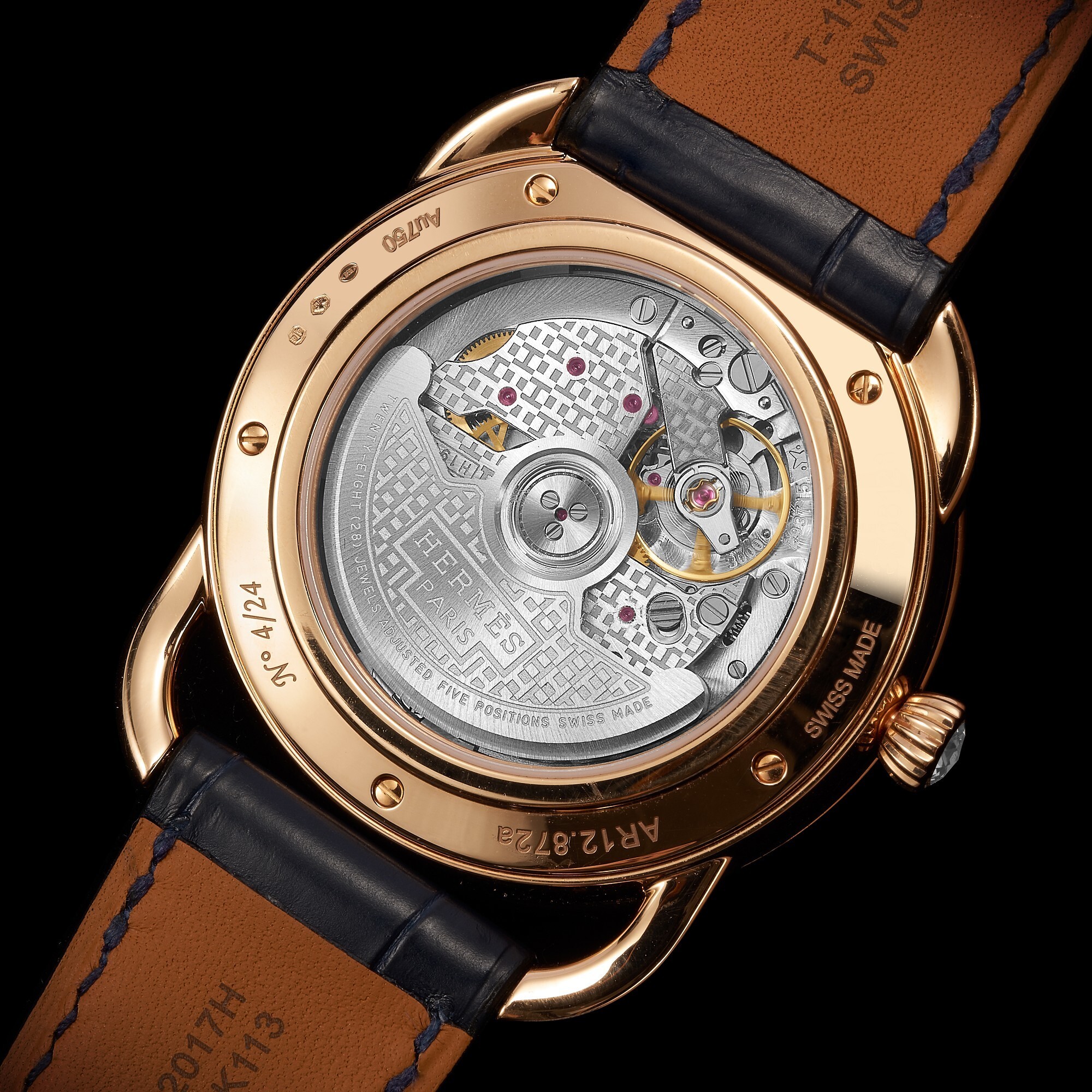 Powered by the Hermès H1912 automatic movement, the watch beats at 28,800 vph with a 50-hour power reserve. The movement’s baseplate and rotor are decorated with the Hermès “H” motif.