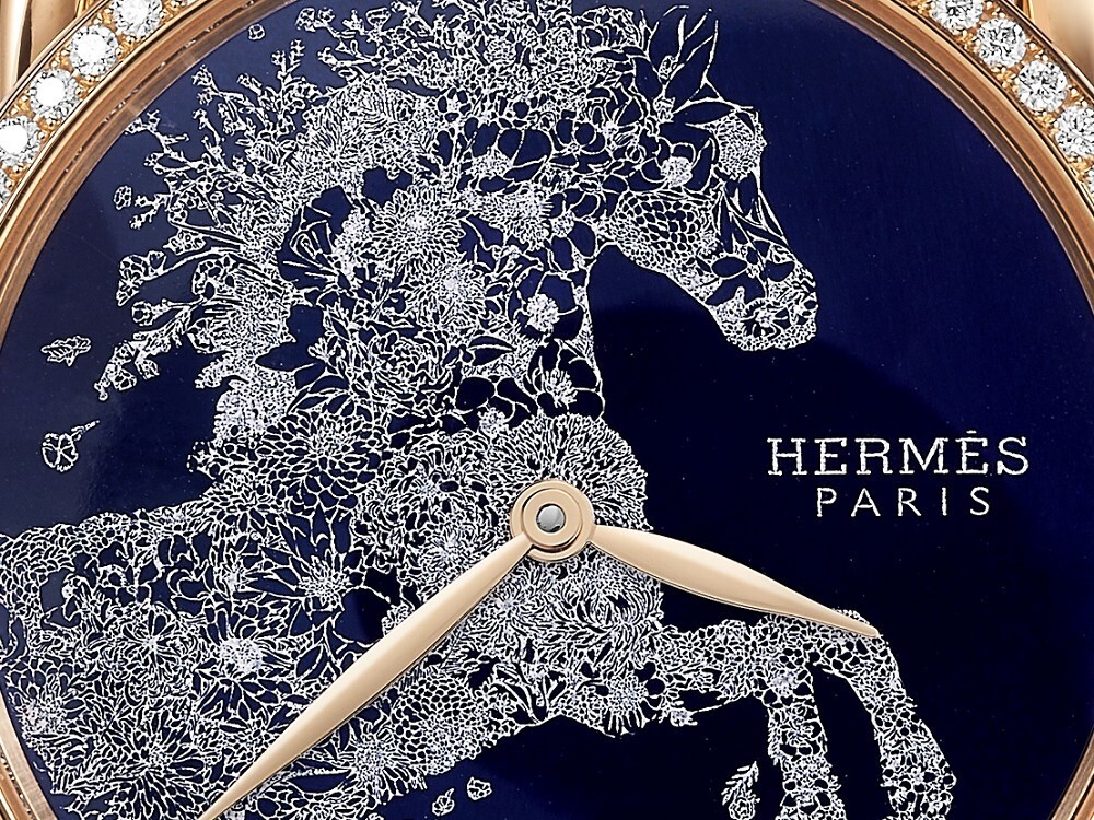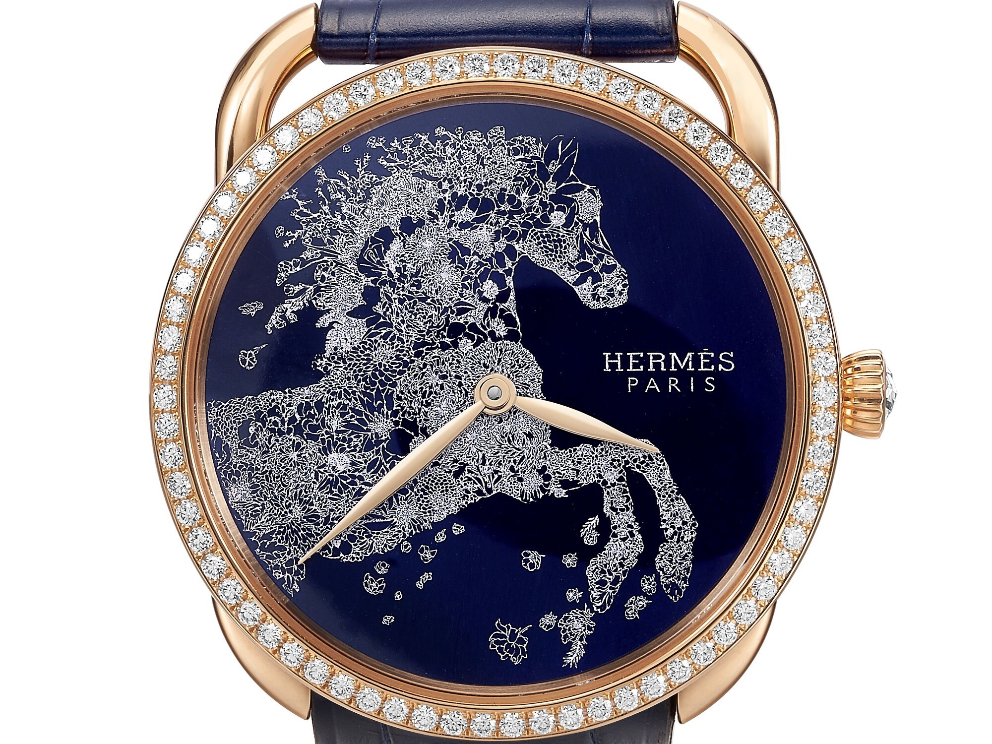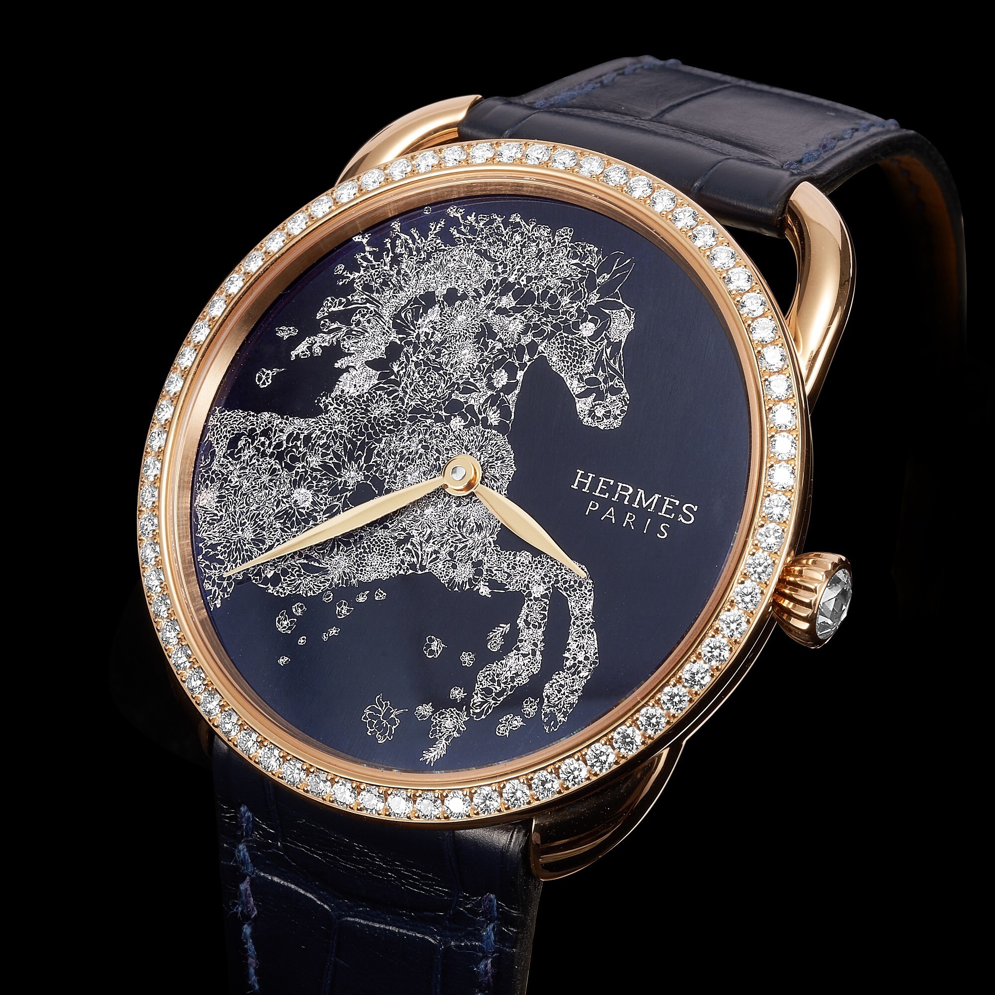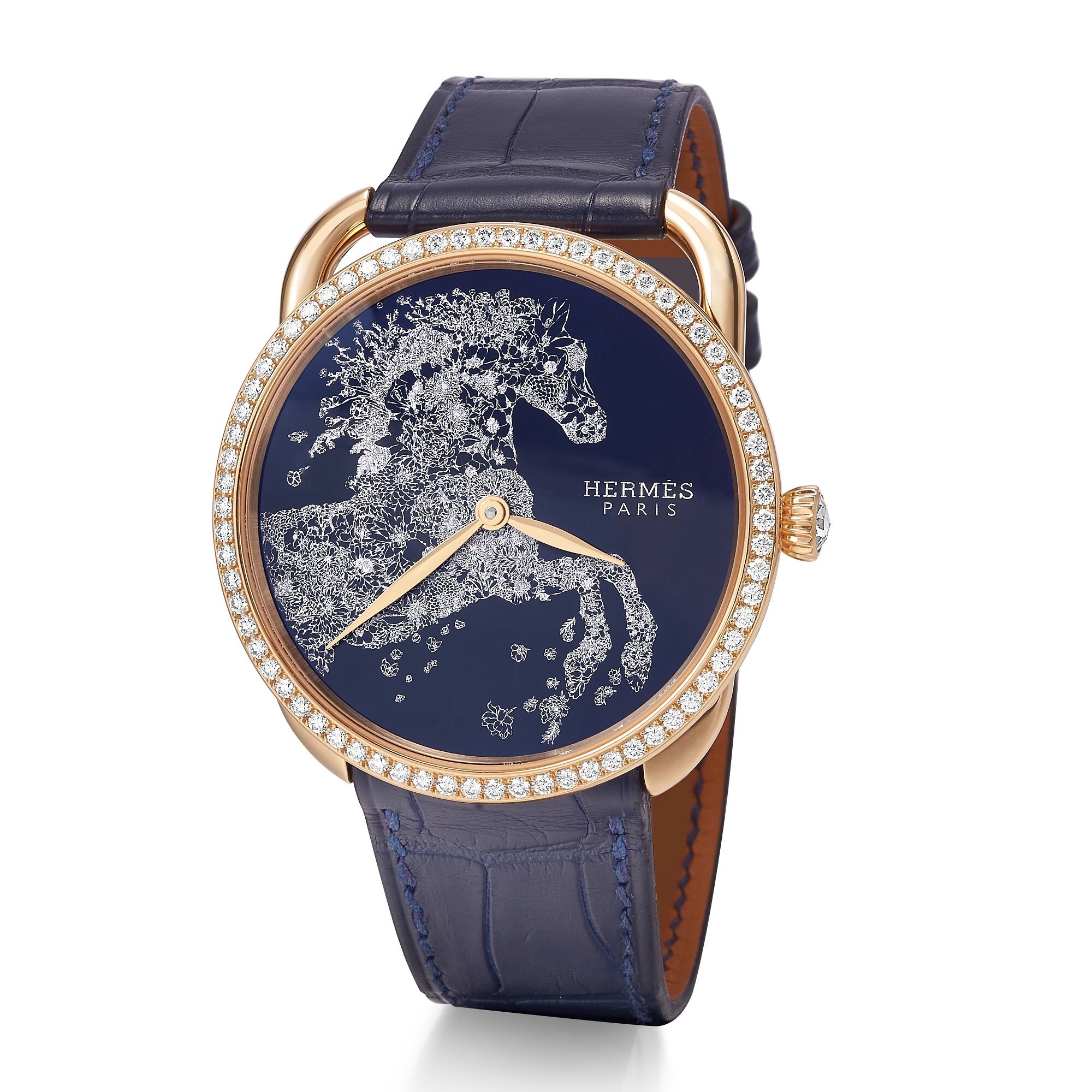Powered by the Hermès H1912 automatic movement, the watch beats at 28,800 vph with a 50-hour power reserve. The movement’s baseplate and rotor are decorated with the Hermès “H” motif.