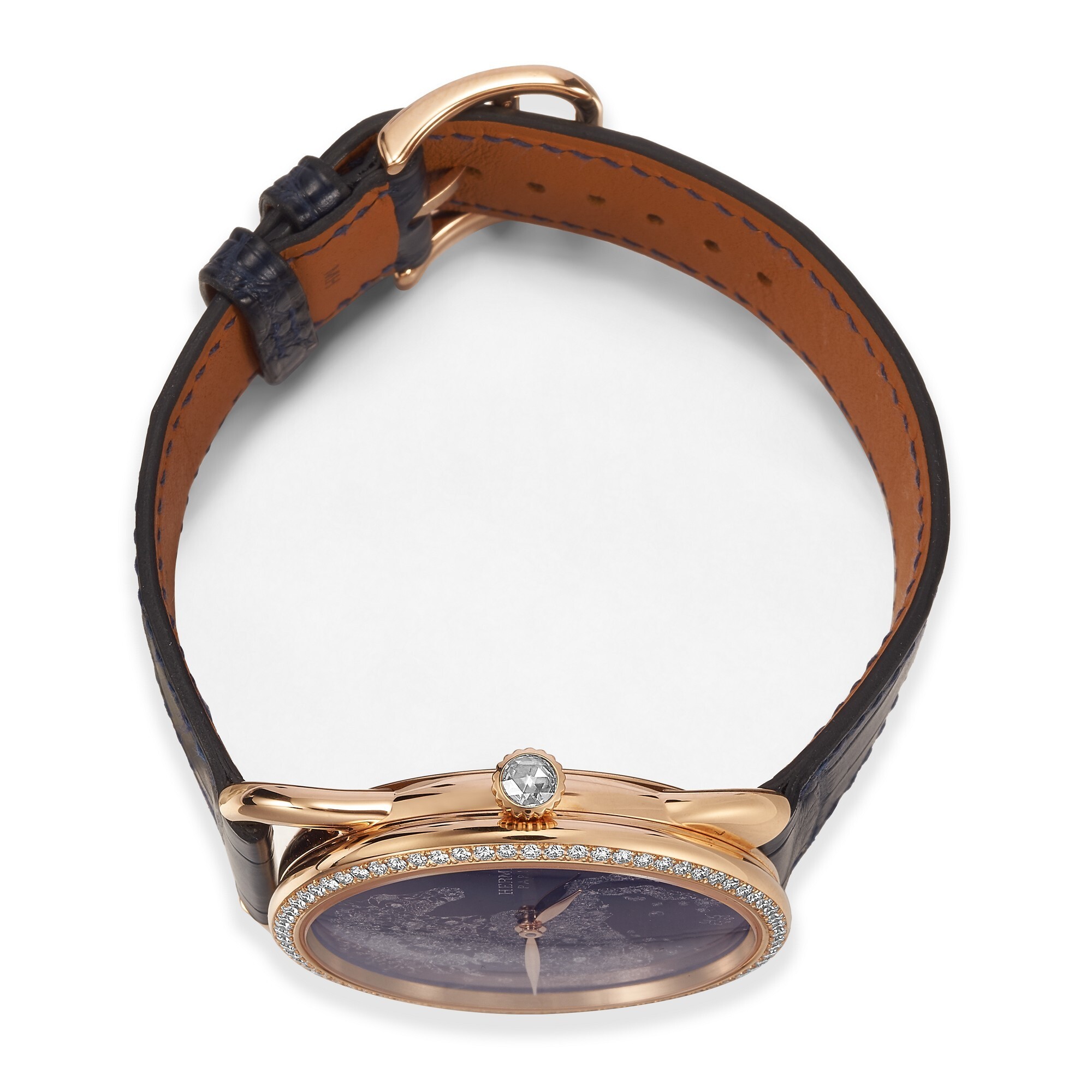 18K rose gold case, 38mm diameter,Diamond-set bezel and crown,Sapphire crystal,Engraved silver foil enamel dial,Leaf-shaped hands,H1912 automatic movement, 28 jewels, 28,800 vph, 50-hour power reserve,Blue alligator leather strap,Water resistance: 30 meters.