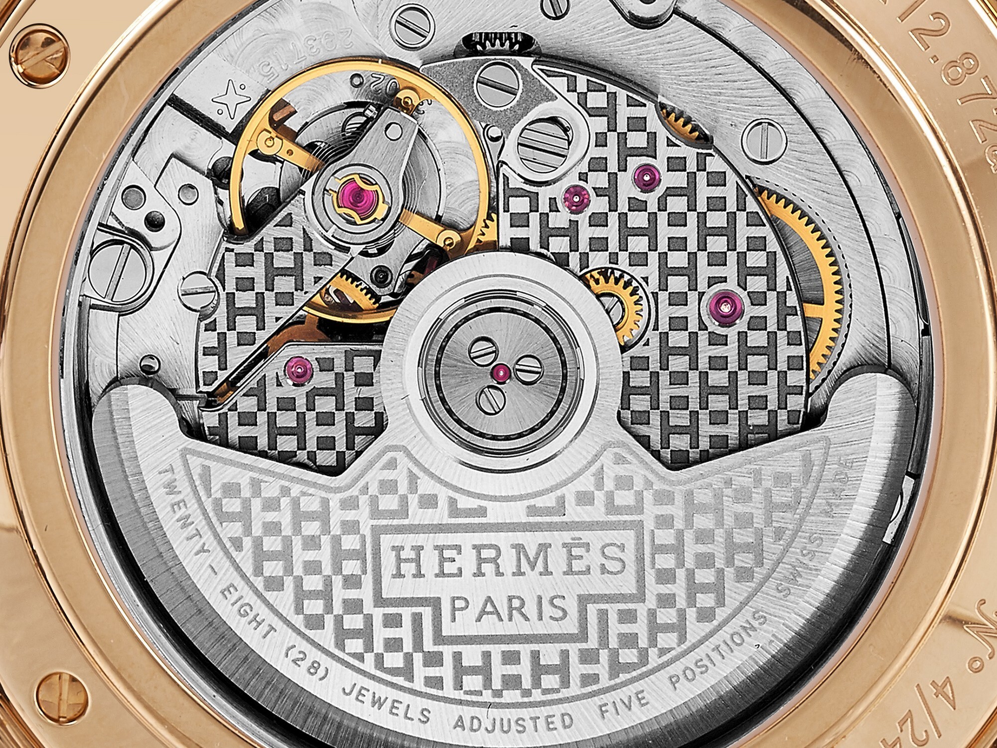 Powered by the Hermès H1912 automatic movement, the watch beats at 28,800 vph with a 50-hour power reserve. The movement’s baseplate and rotor are decorated with the Hermès “H” motif.