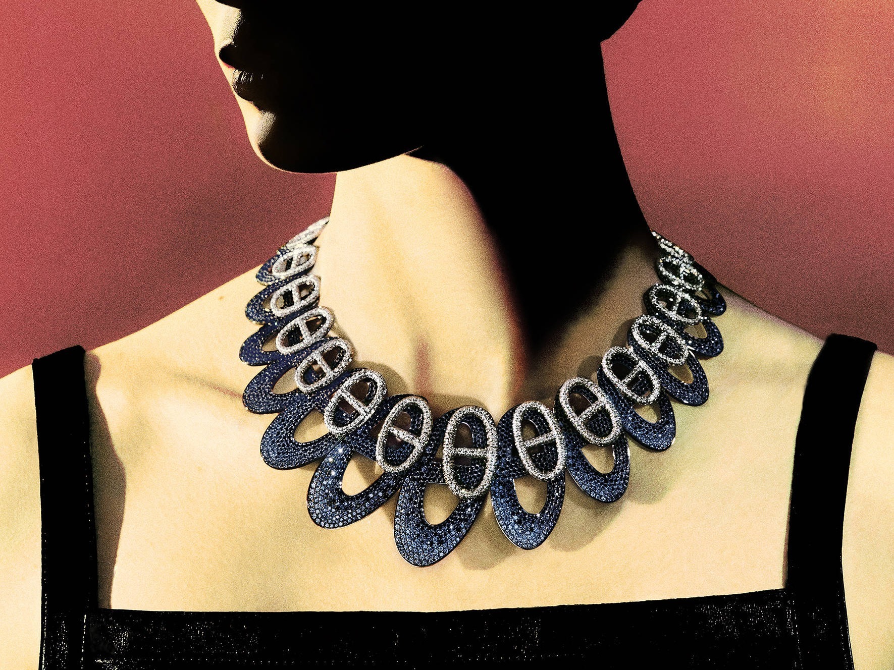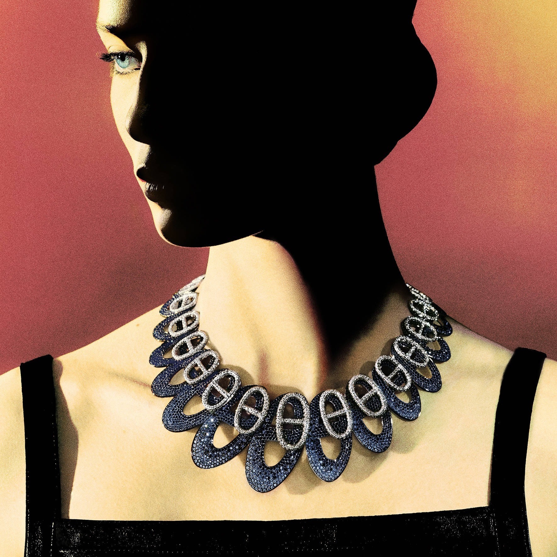 Hermès introduced this “Chaînes d’Ombre” jewelry set in its 2022 new high jewelry collection “Les Jeux de l’Ombre.” Inspired by the poetic interplay of “light and shadow,” the designer uses brilliant diamonds to interpret light and dark-colored gemstones to capture shadows. The name of the piece translates from French as “Chain of Shadows.”