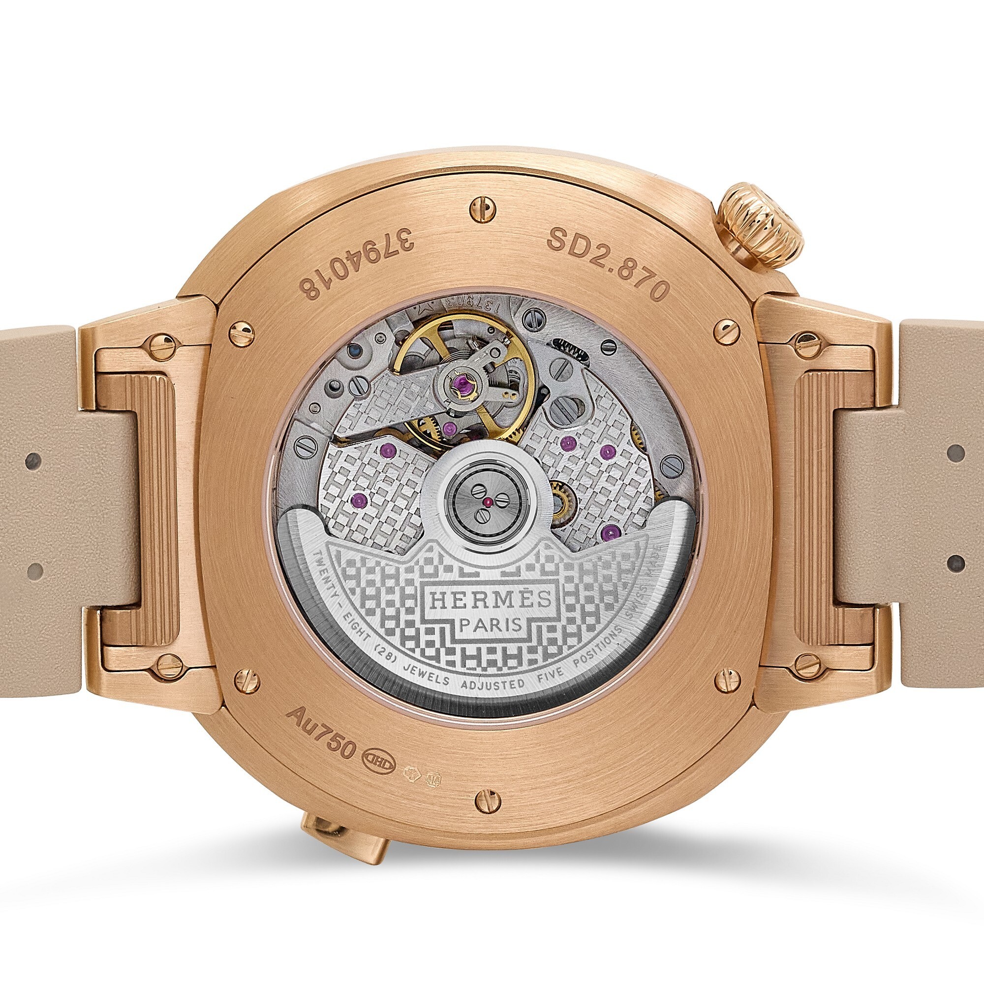 The 39mm rose gold case continues the minimalist and geometric art aesthetic, presenting sharp lines and bold shapes. The bezel and dial are circular, while the case is a rounded square, with polished, gem-cut “facets” on both sides, offering an organic fusion of circles and squares that creates a pleasing sense of order. The crown is positioned at 2 o’clock, creating a seamless visual effect and allowing the watch to be worn comfortably on either wrist.