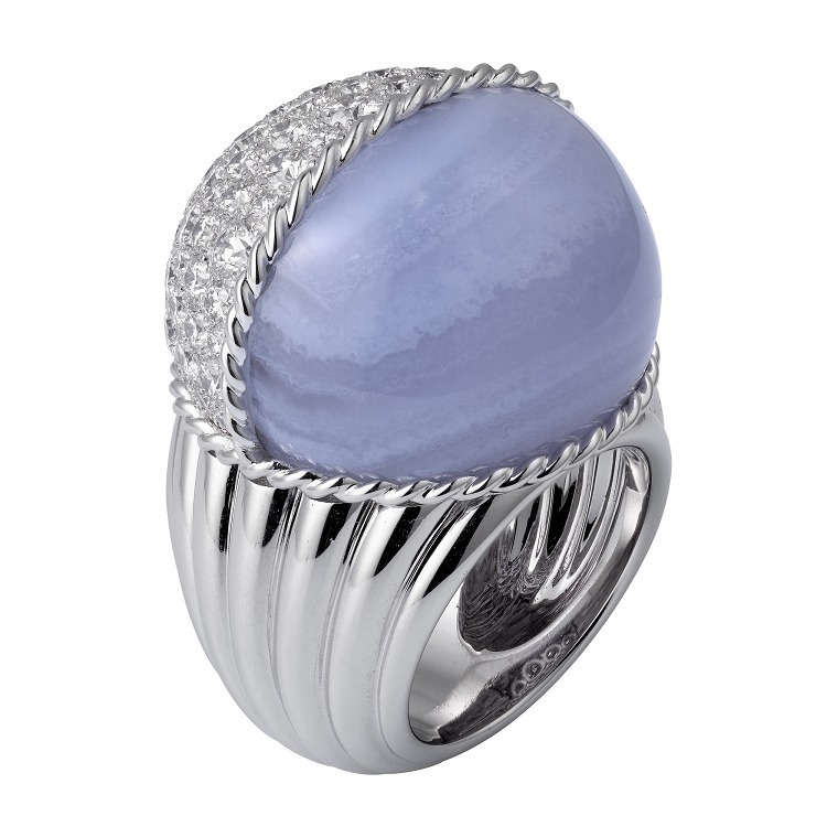 The clasp is meticulously pavé-set with diamonds in a honeycomb-like pattern, while each of its four corners retains the