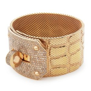 The bracelet itself is crafted using the refined Milanese mesh technique, composed of hexagonal links that contour perfectly to the wrist — a style often seen in luxury watch bracelets. To echo Hermès’s leather heritage, the surface of the mesh is engraved with a crocodile-skin motif, creating a seamless dialogue between haute joaillerie and artisanal leathercraft.