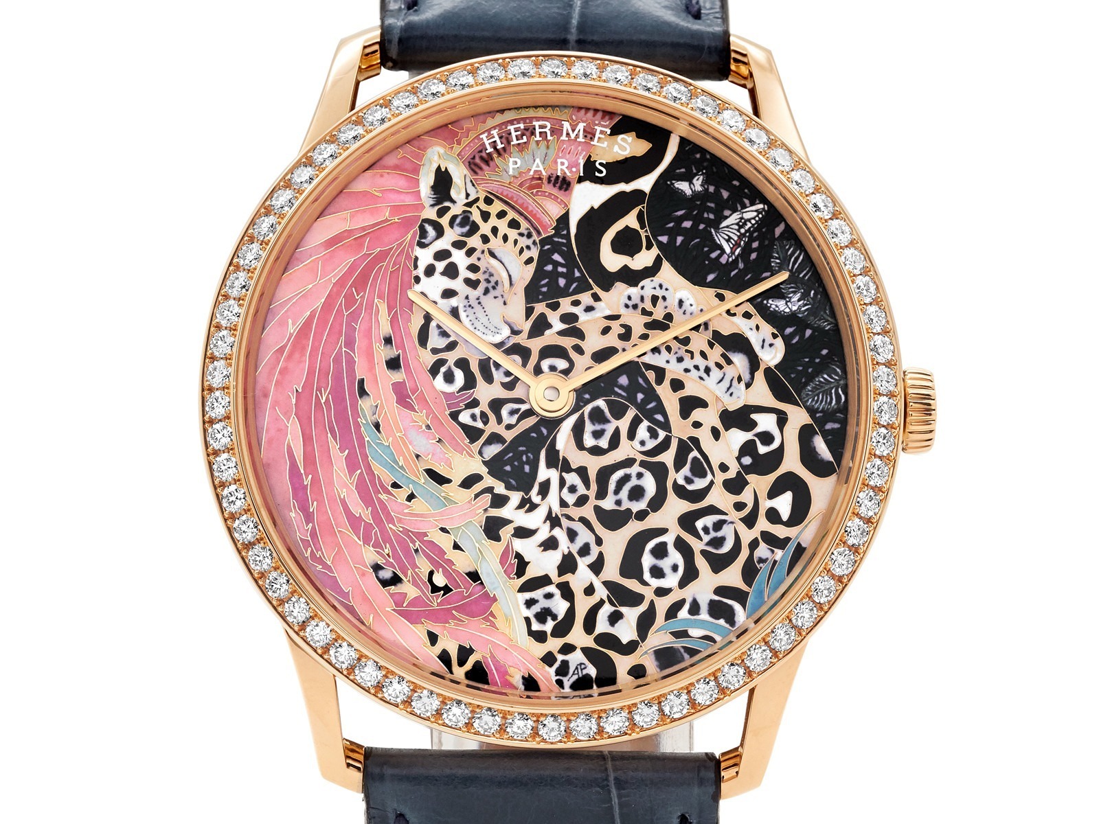 Case: 18K rose gold,Diameter: 39.5 mm,Bezel: Set with 66 diamonds,Crystal: Sapphire,Dial: White gold base with cloisonné and miniature enamel painting by Anita Porchet,Movement: Hermès Caliber H1950, automatic winding with micro-rotor,Jewels: 29,Frequency: 21,600 vph,Power Reserve: 42 hours,Strap: Blue alligator leather with 18K rose gold buckle,Water Resistance: 30 meters,Limited Edition: 6 pieces.