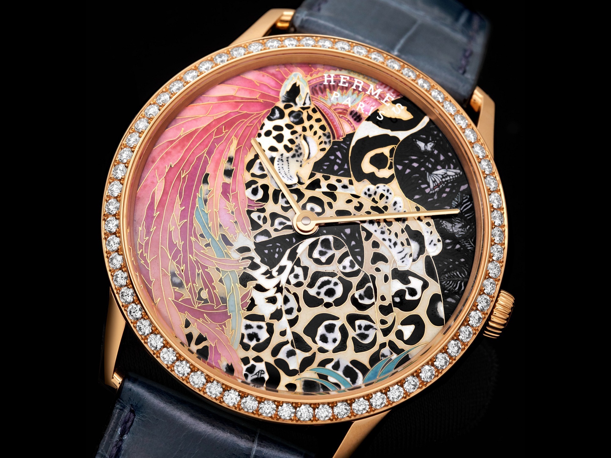 For this exceptional edition, Hermès collaborated with renowned Swiss enameler Anita Porchet, who crafted the dial on a white gold base using two meticulous handcraft techniques. First, cloisonné enamel was employed to outline the jaguar’s body, feathers, and distinctive markings with fine gold wires. Then, the miniature painting enamel technique was applied, layering delicate hand-painted pigments to achieve vivid contrasts and seamless tonal gradients. Each layer was individually fired multiple times at high temperatures to set the colors and create extraordinary depth and luminosity.