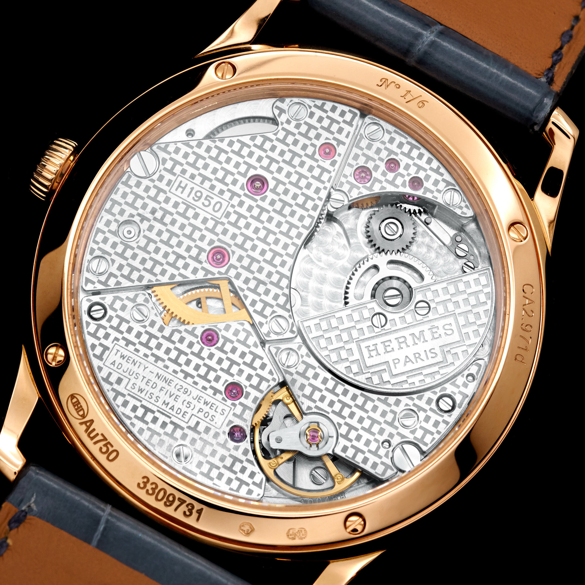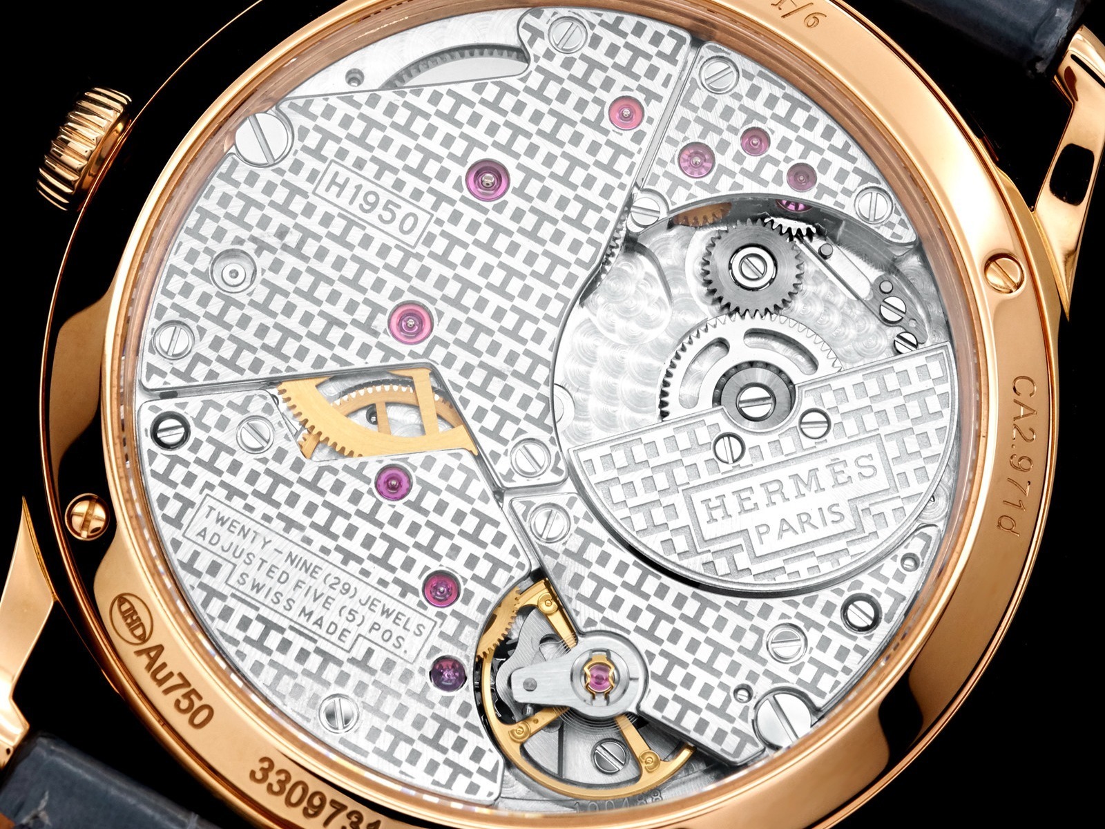 The 39.5 mm rose gold case features a diamond-set bezel with 66 brilliant-cut stones, framing the dial’s pure two-hand layout. Turning the watch over reveals the Hermès H1950 self-winding movement, featuring a micro-rotor and measuring only 2.6 mm thick. Beating at 21,600 vph, it delivers a 42-hour power reserve. Water resistance is rated to 30 meters.