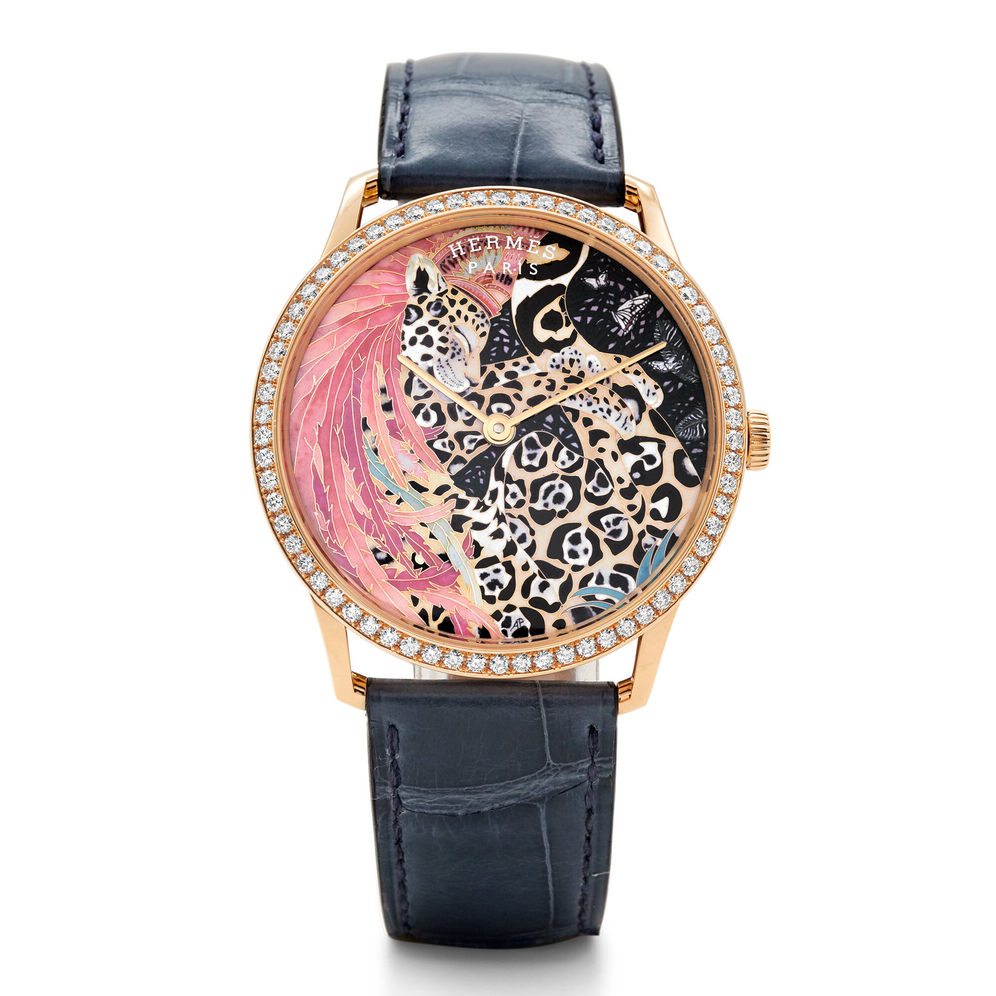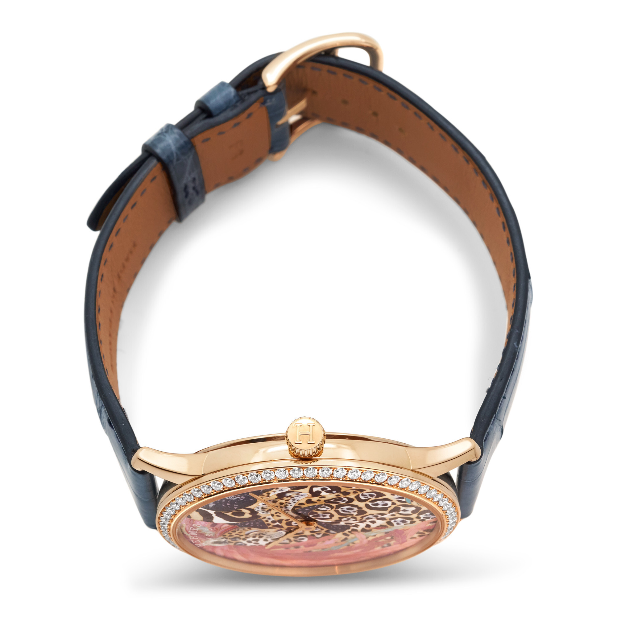 Case: 18K rose gold,Diameter: 39.5 mm,Bezel: Set with 66 diamonds,Crystal: Sapphire,Dial: White gold base with cloisonné and miniature enamel painting by Anita Porchet,Movement: Hermès Caliber H1950, automatic winding with micro-rotor,Jewels: 29,Frequency: 21,600 vph,Power Reserve: 42 hours,Strap: Blue alligator leather with 18K rose gold buckle,Water Resistance: 30 meters,Limited Edition: 6 pieces.