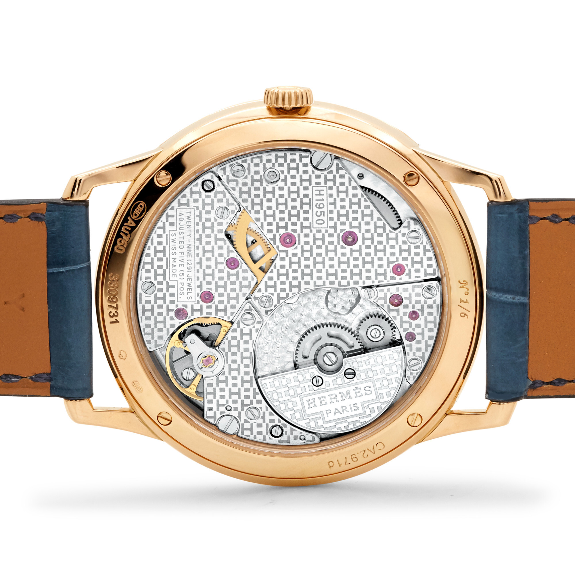 The 39.5 mm rose gold case features a diamond-set bezel with 66 brilliant-cut stones, framing the dial’s pure two-hand layout. Turning the watch over reveals the Hermès H1950 self-winding movement, featuring a micro-rotor and measuring only 2.6 mm thick. Beating at 21,600 vph, it delivers a 42-hour power reserve. Water resistance is rated to 30 meters.