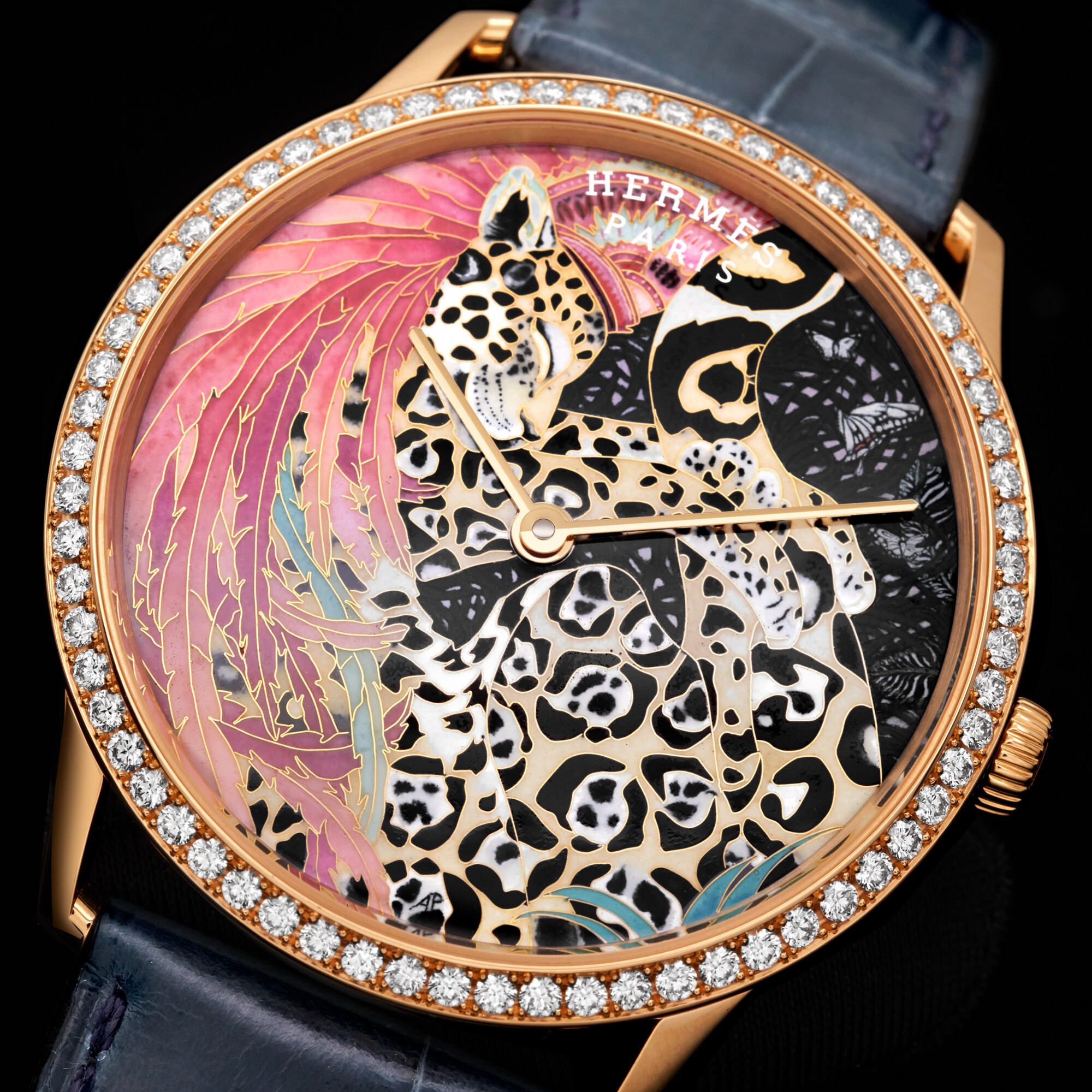 For this exceptional edition, Hermès collaborated with renowned Swiss enameler Anita Porchet, who crafted the dial on a white gold base using two meticulous handcraft techniques. First, cloisonné enamel was employed to outline the jaguar’s body, feathers, and distinctive markings with fine gold wires. Then, the miniature painting enamel technique was applied, layering delicate hand-painted pigments to achieve vivid contrasts and seamless tonal gradients. Each layer was individually fired multiple times at high temperatures to set the colors and create extraordinary depth and luminosity.