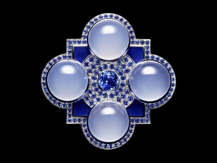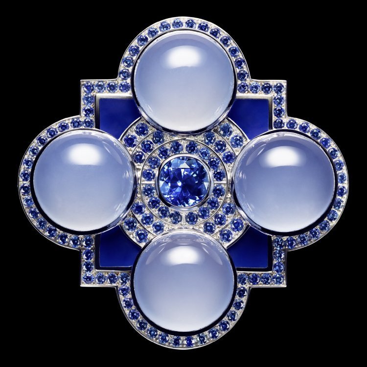 The blue ring represents the circle. Guided by the philosophy of “the square within the circle,” the design centers on a 1.11-carat round brilliant-cut sapphire, encircled by pavé-set sapphires and interspersed with four cabochon-cut blue chalcedonies. The positioning of the four round gems subtly outlines a perfect square within the circle.