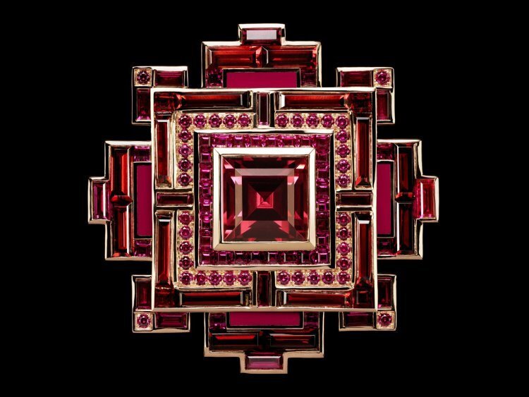 The red ring pairs the color red with the square. At its center lies a 3.25-carat square-cut almandine garnet, surrounded by baguette-cut garnets as well as round and rectangular-cut rubies. The interplay of different gemstone species and cuts creates a dynamic depth of color and light, forming a layered, endlessly extending matrix.