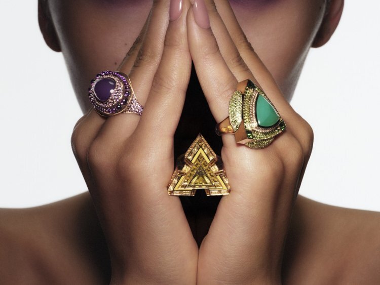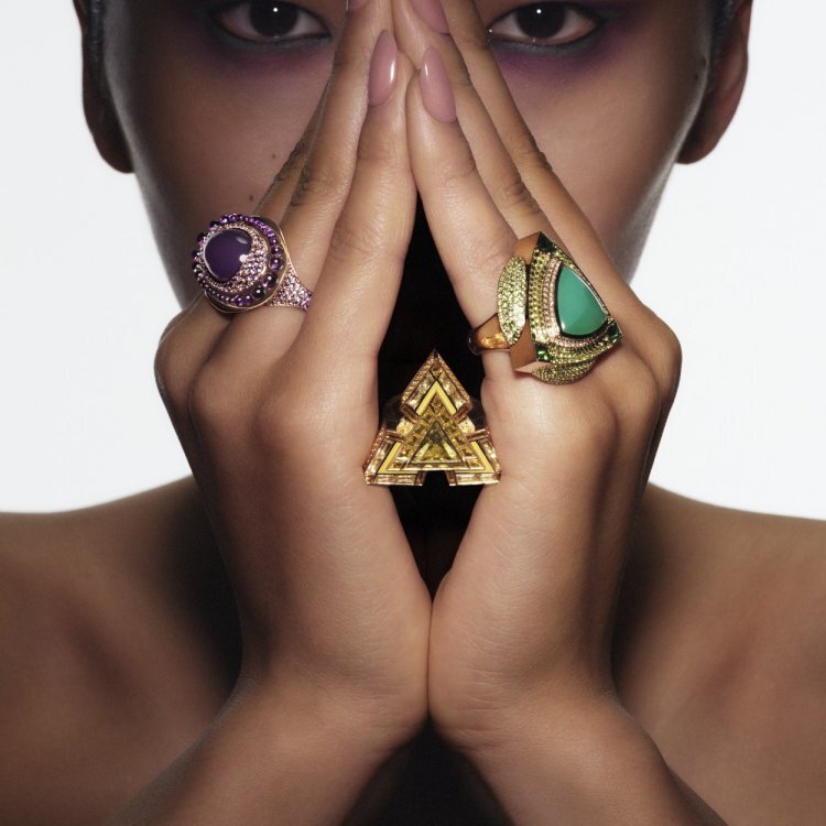 The yellow ring pairs yellow gemstones with the triangle, resulting in the boldest design of the collection. Its centerpiece is a 1.53-carat triangular-cut yellow beryl, framed by custom-cut trapezoid yellow sapphires that emphasize the sharp geometry of the form.