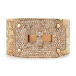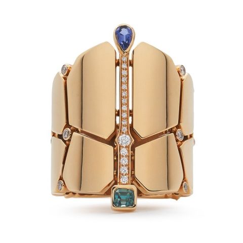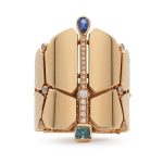 The blue ring represents the circle. Guided by the philosophy of “the square within the circle,” the design centers on a 1.11-carat round brilliant-cut sapphire, encircled by pavé-set sapphires and interspersed with four cabochon-cut blue chalcedonies. The positioning of the four round gems subtly outlines a perfect square within the circle.