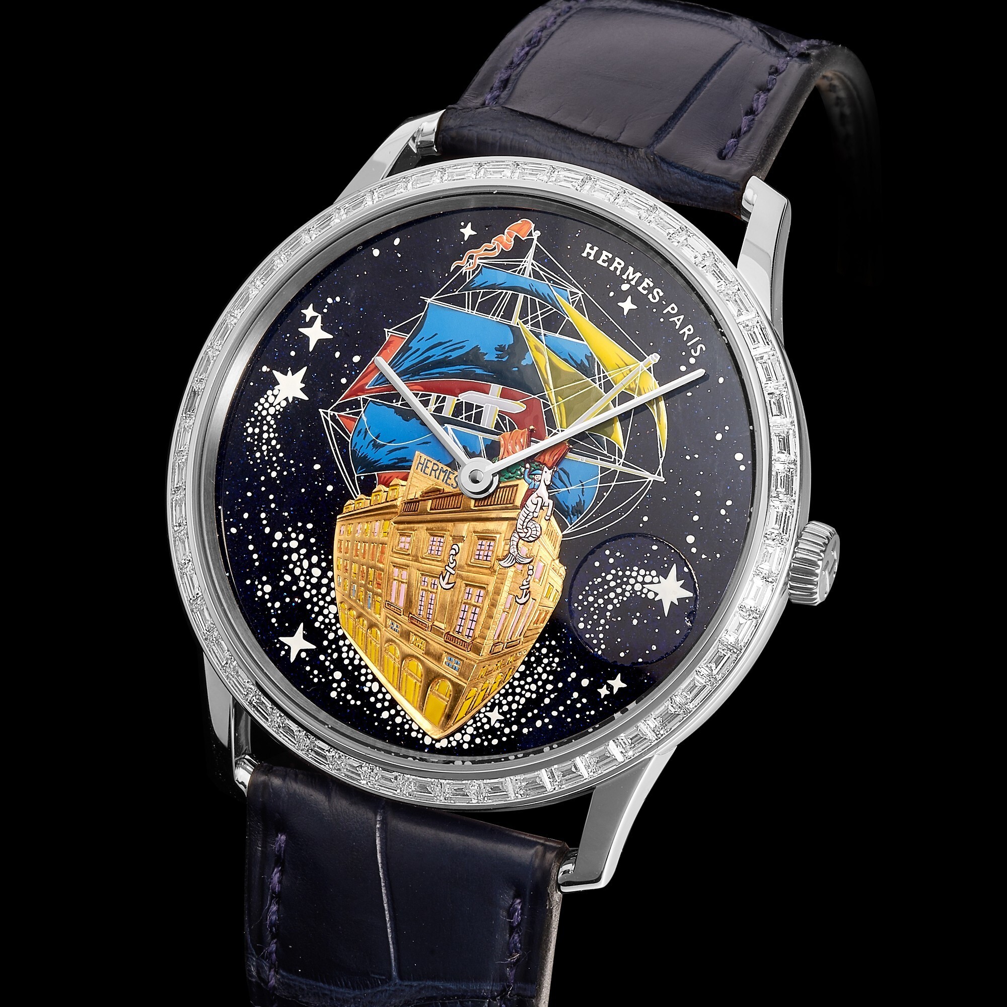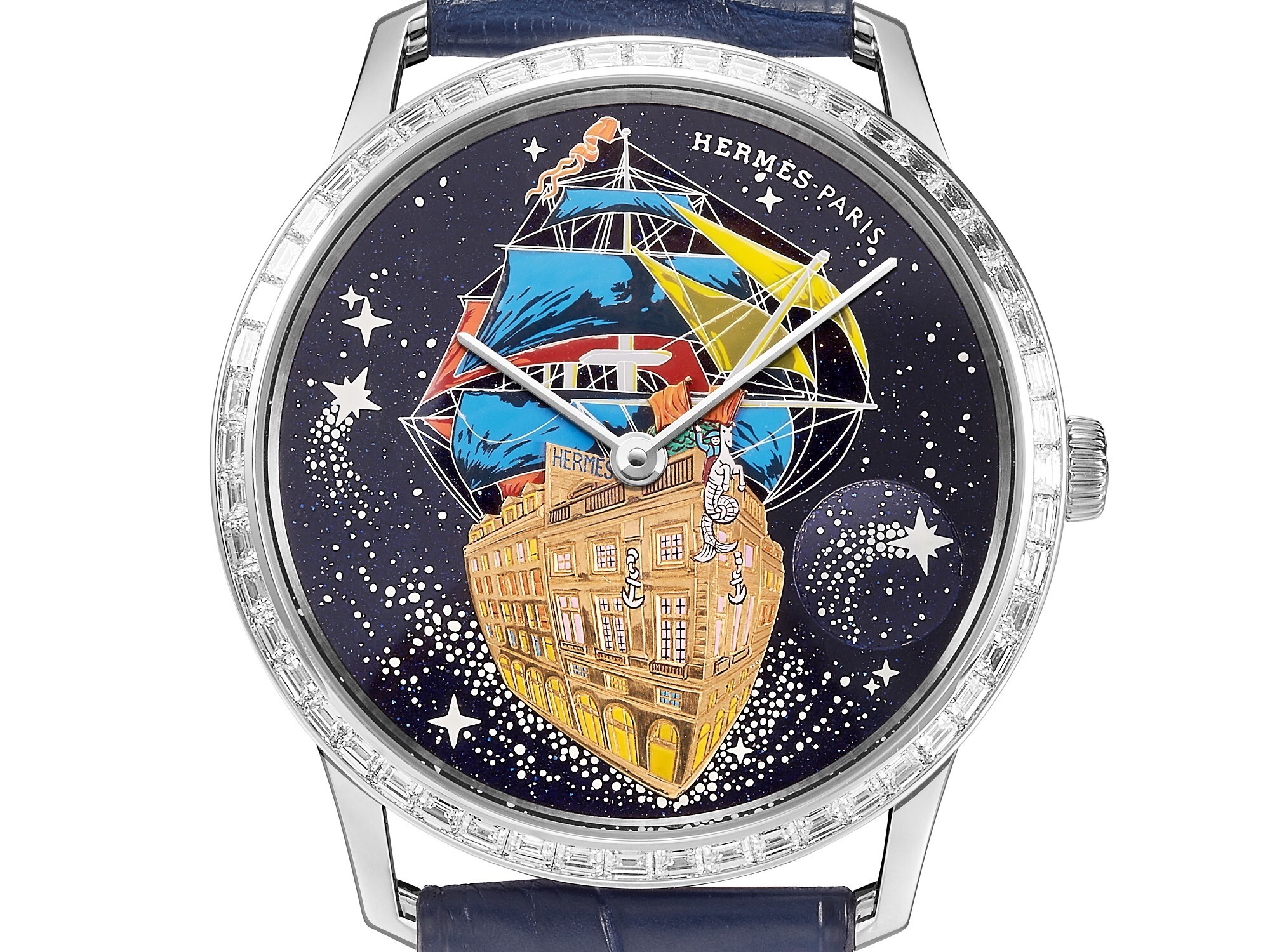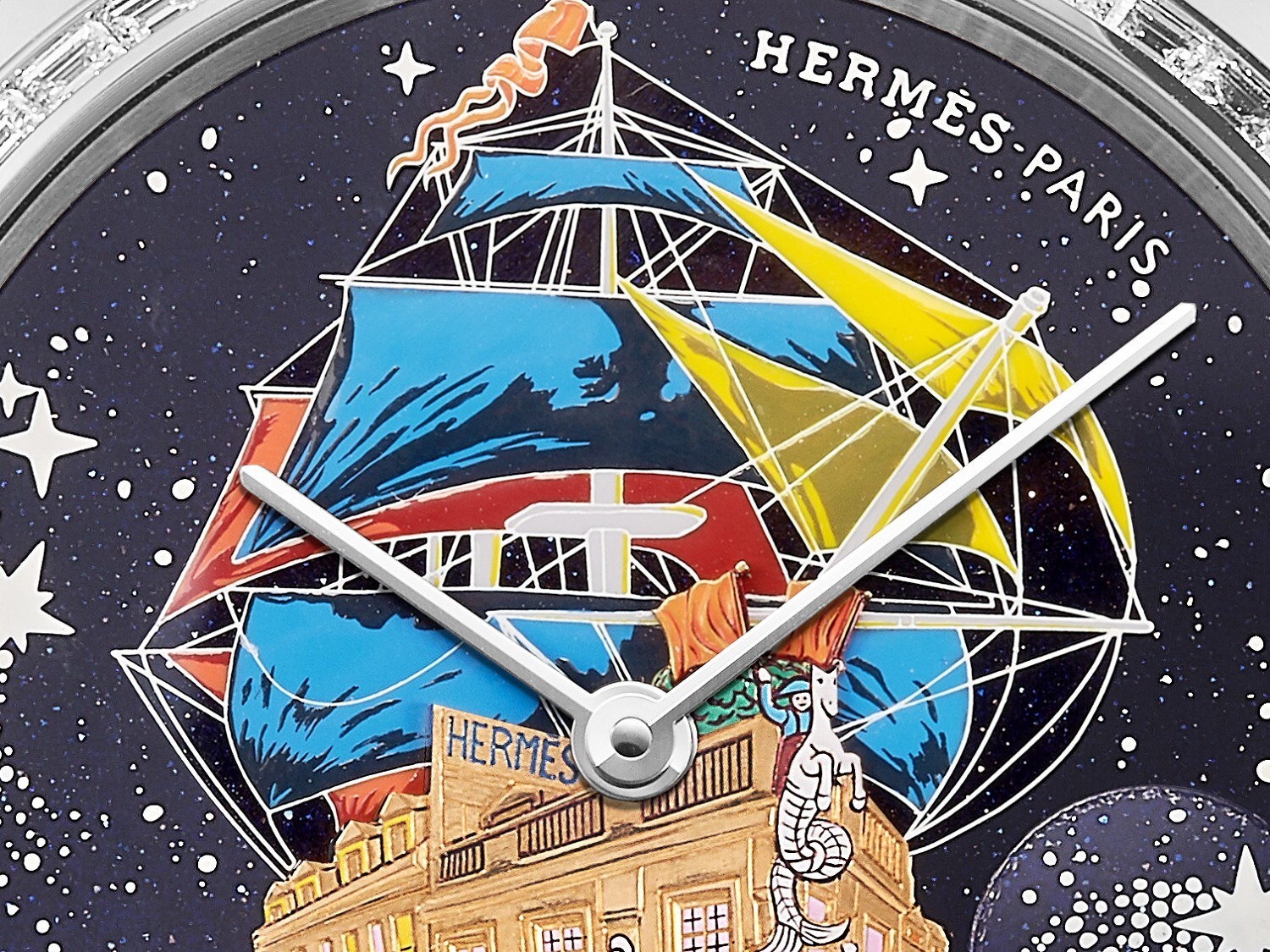 The Slim d’Hermès Flagship watch features a dial inspired by the eponymous silk scarf designed for Hermès by French artist Dimitri Rybaltchenko. The dial combines miniature painting and engraving techniques to depict a dreamlike scene of the “Hermès Flagship” sailing across a starlit sea.