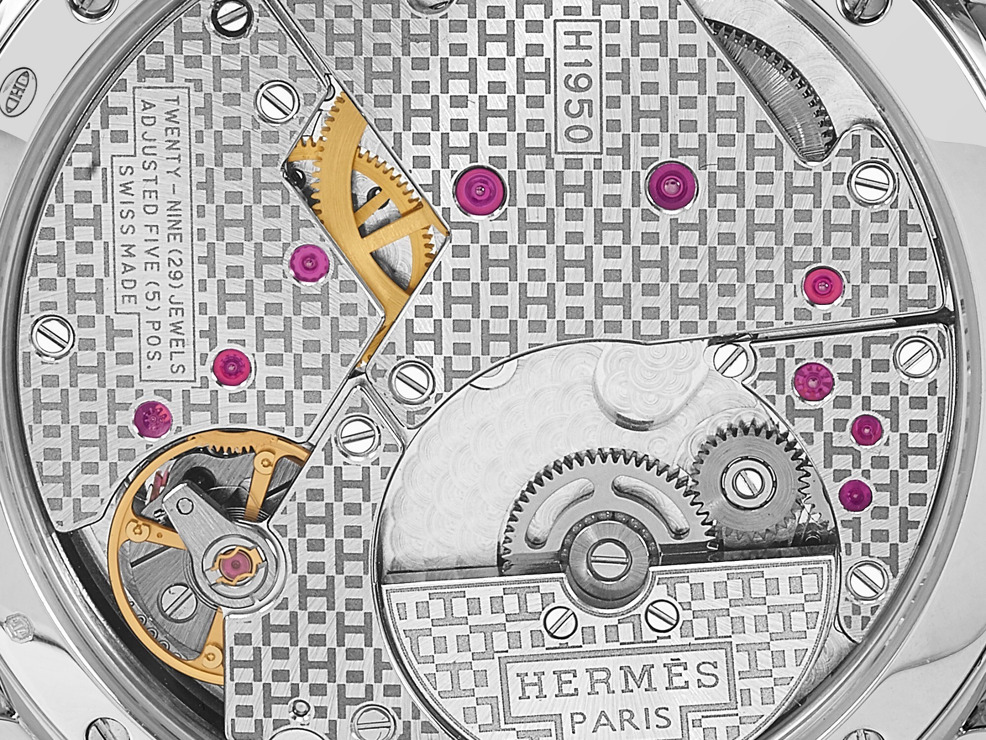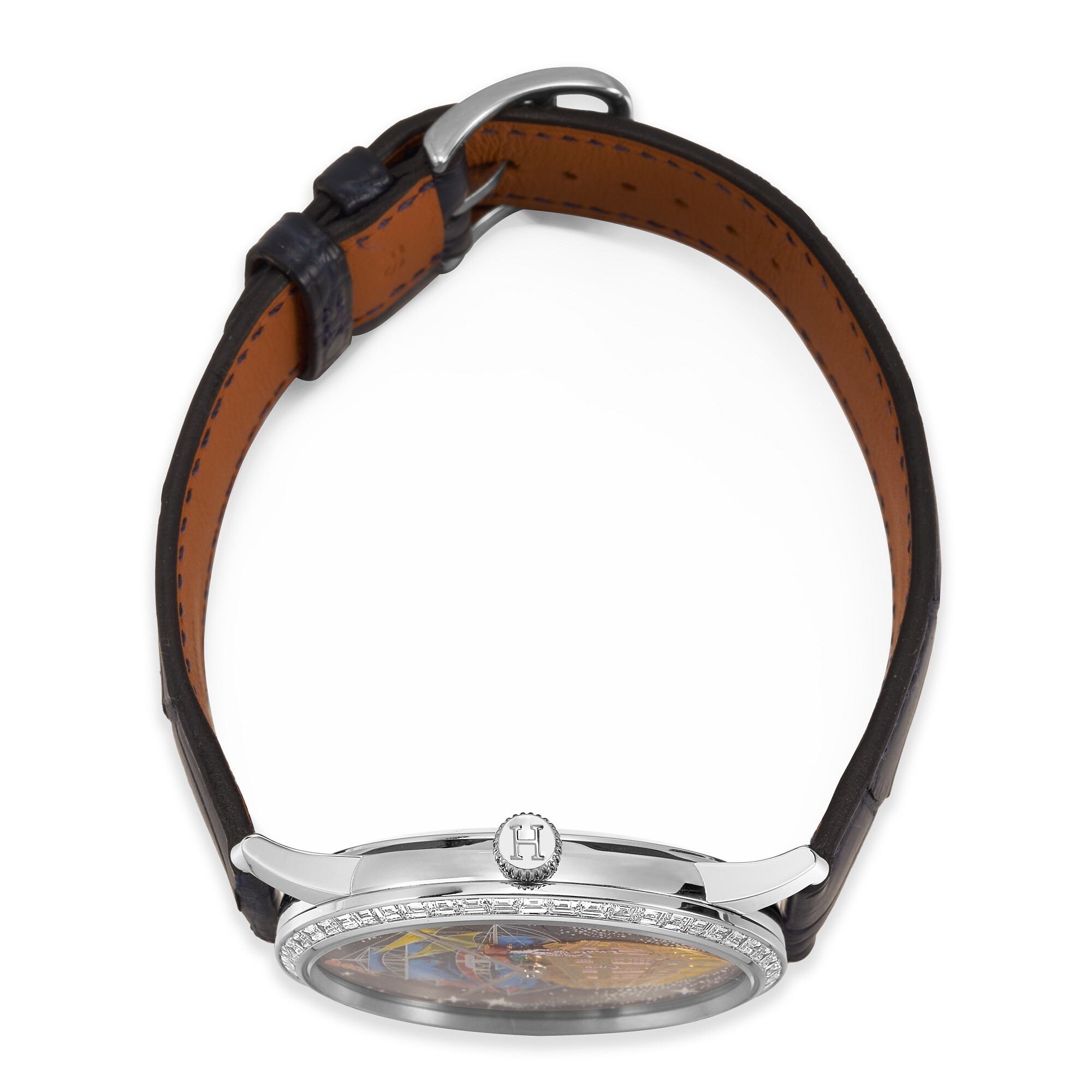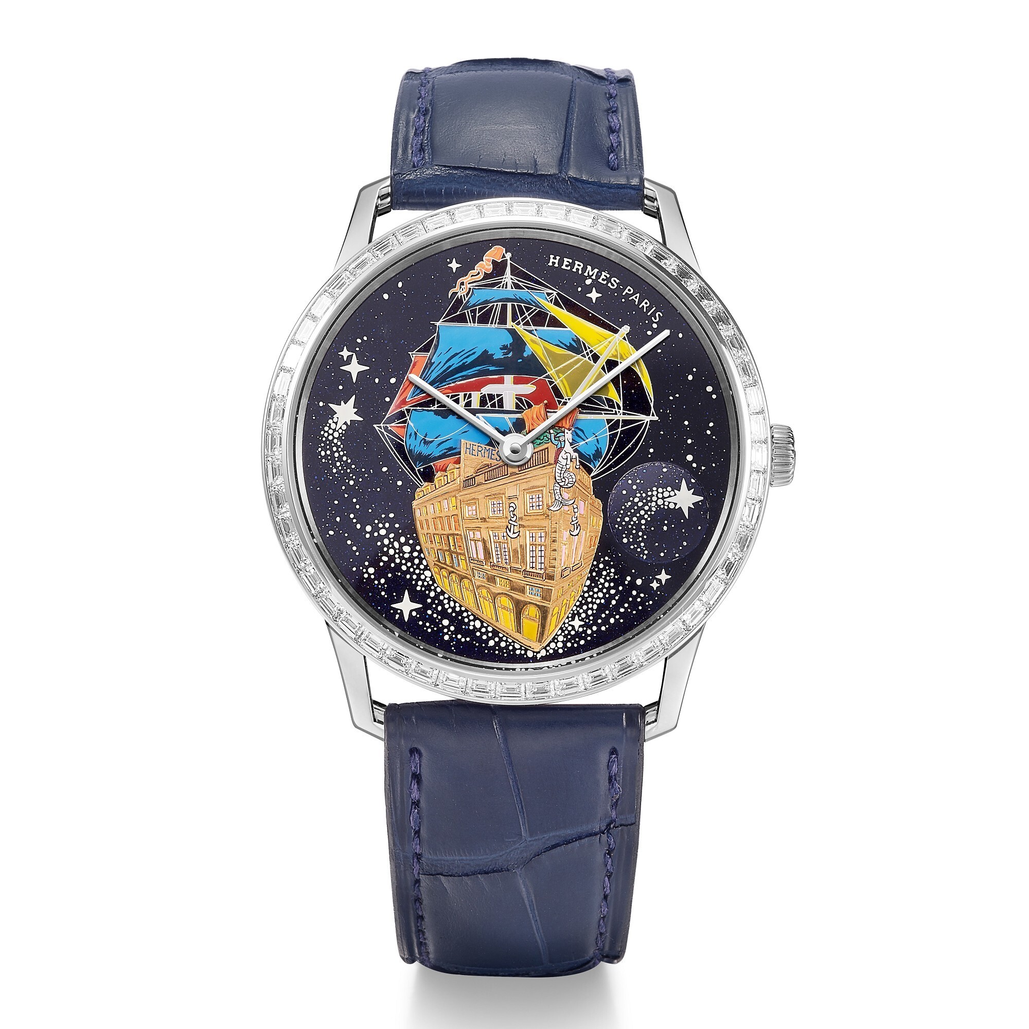 The Slim d’Hermès Flagship watch features a dial inspired by the eponymous silk scarf designed for Hermès by French artist Dimitri Rybaltchenko. The dial combines miniature painting and engraving techniques to depict a dreamlike scene of the “Hermès Flagship” sailing across a starlit sea.