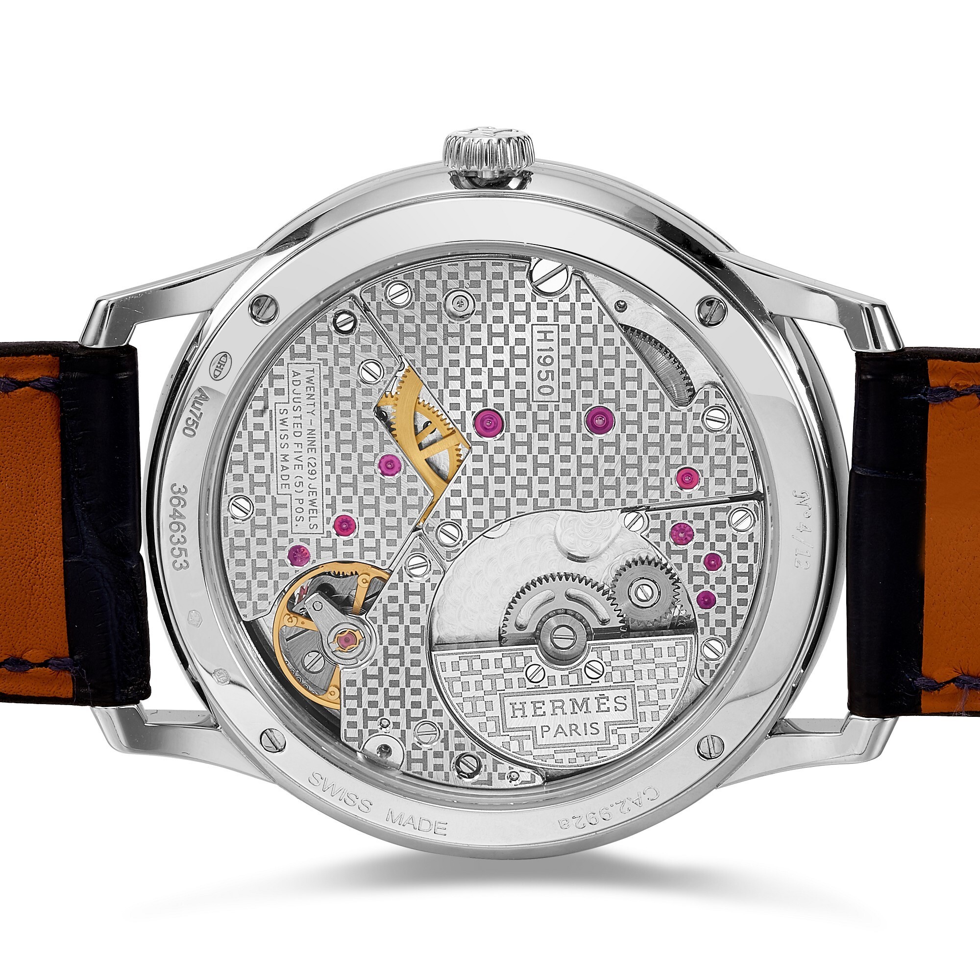 The 39.5mm white gold case is set with diamonds on the bezel and houses the H1950 automatic movement, beating at 21,600 vph with a 48-hour power reserve. The watch is paired with a deep blue alligator leather strap.