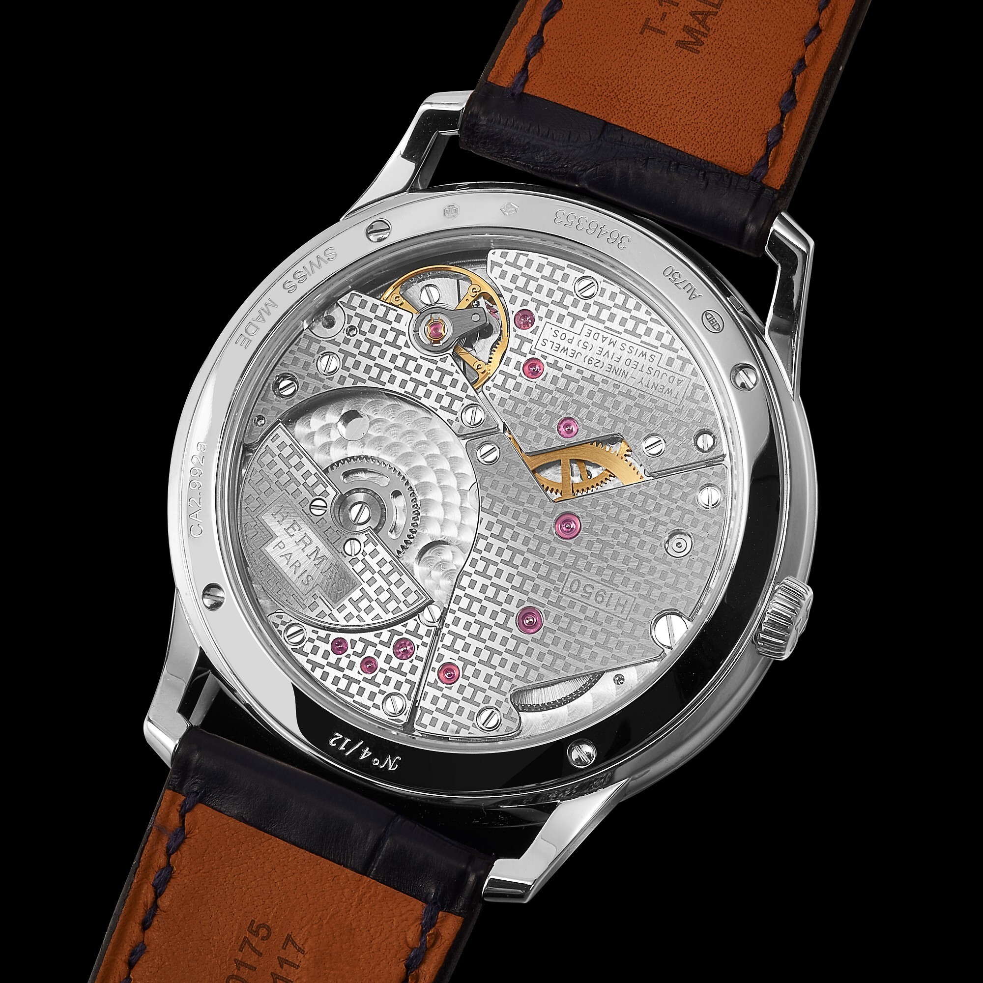 The blue aventurine dial evokes the tranquil ocean and night sky. At the center, a gold-engraved ship transforms from the legendary Hermès flagship store at 24 Rue du Faubourg Saint-Honoré in Paris. Miniature artisans apply multiple layers of paint and baking on the aventurine, creating a rich, three-dimensional lacquer effect.