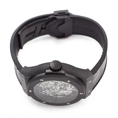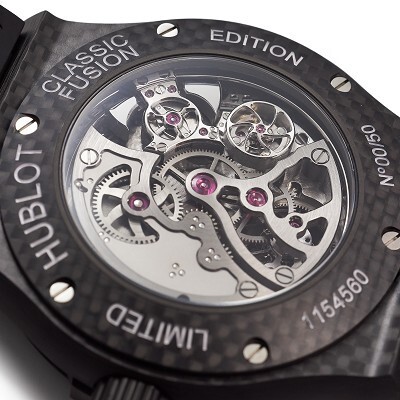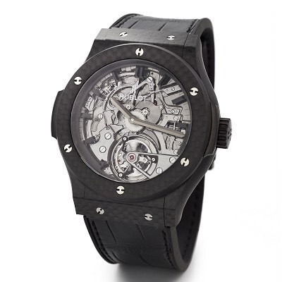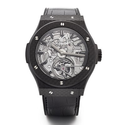 The Classic Fusion Tourbillon Cathedral Minute Repeater Carbon features a 45 mm carbon-fiber case, sapphire crystal front and back, HUB 8001 manual-winding movement, 21,600 vph, 5-day power reserve, and an alligator-on-rubber strap. Complications include a tourbillon and minute repeater.