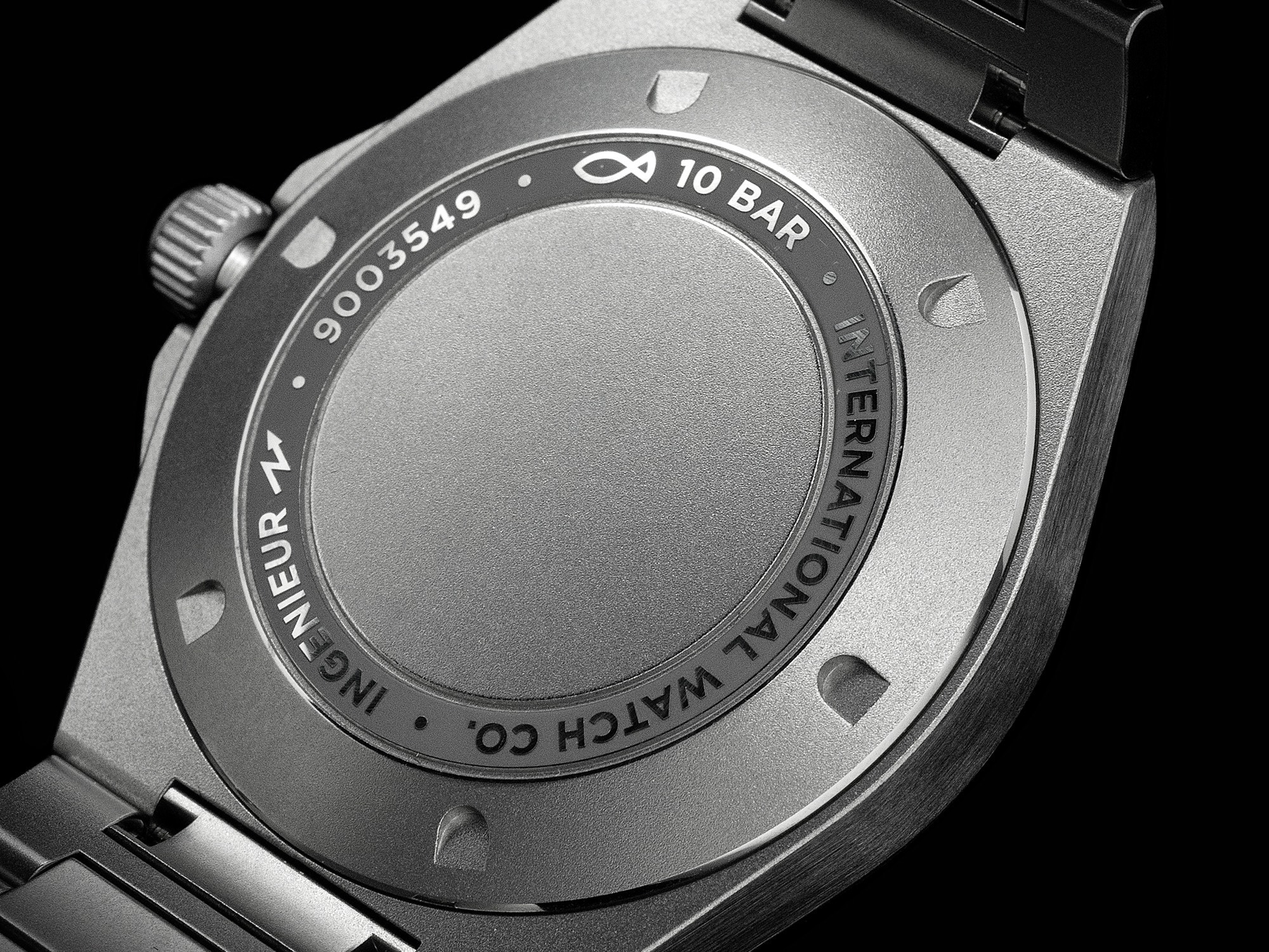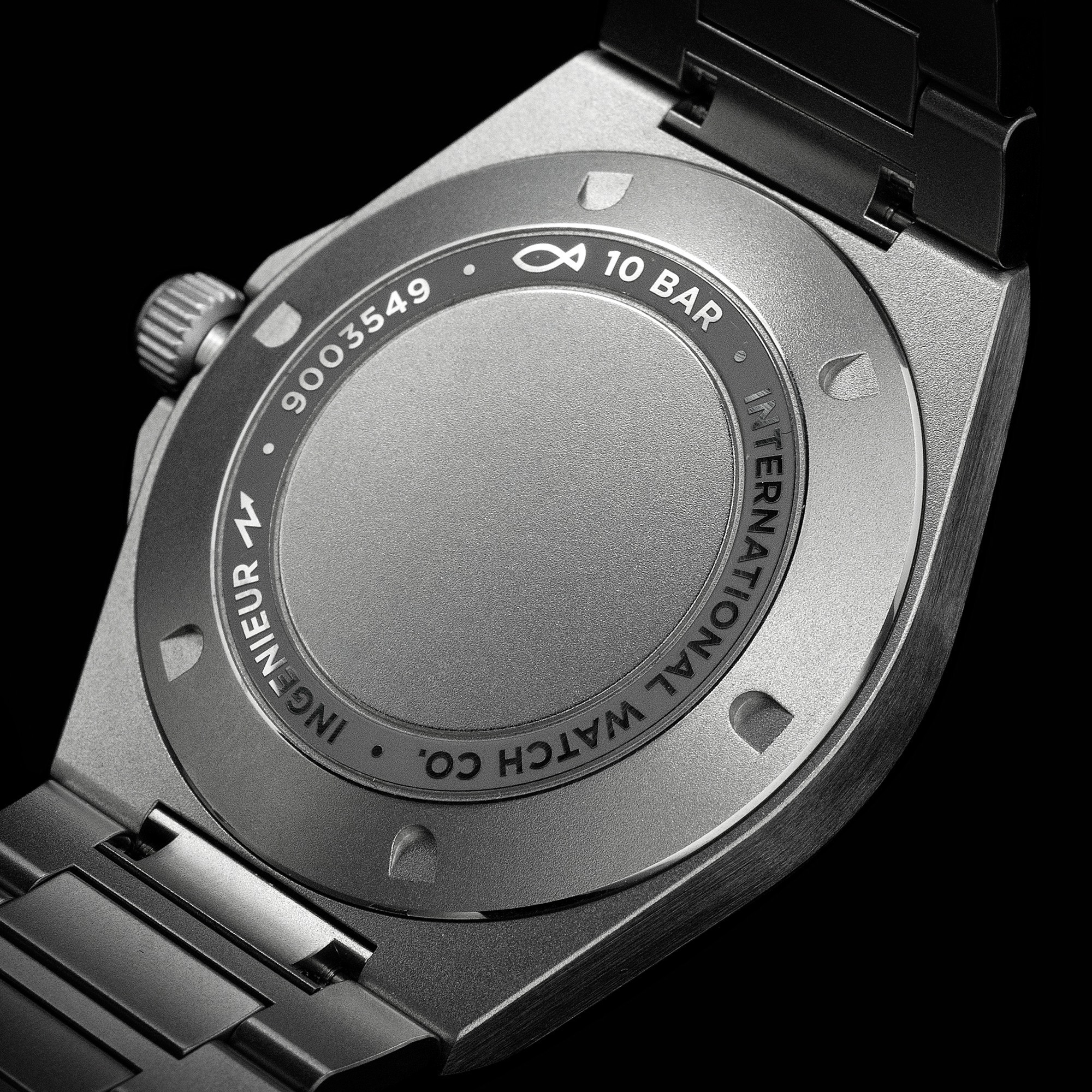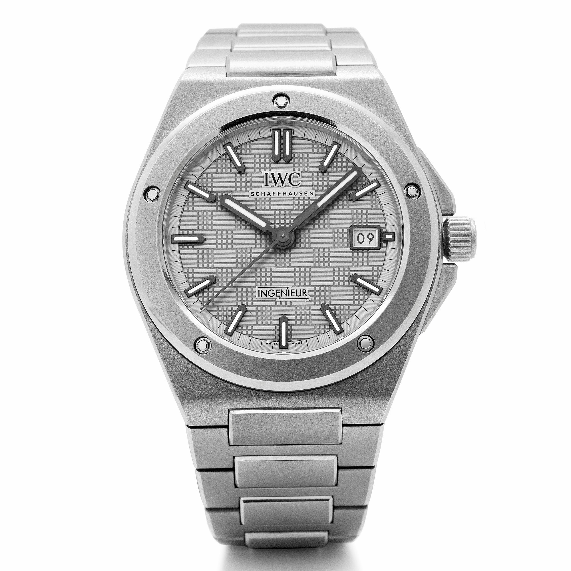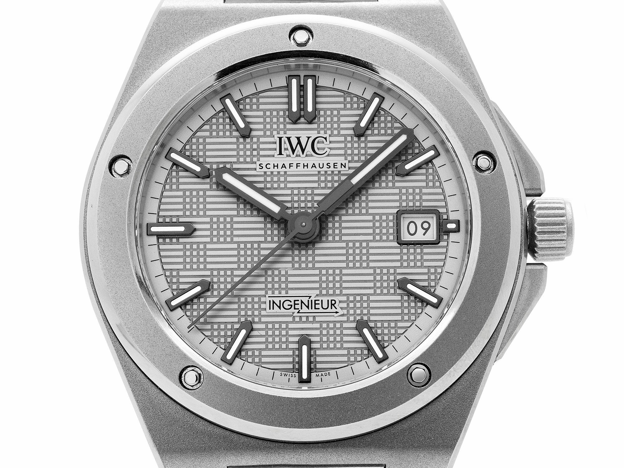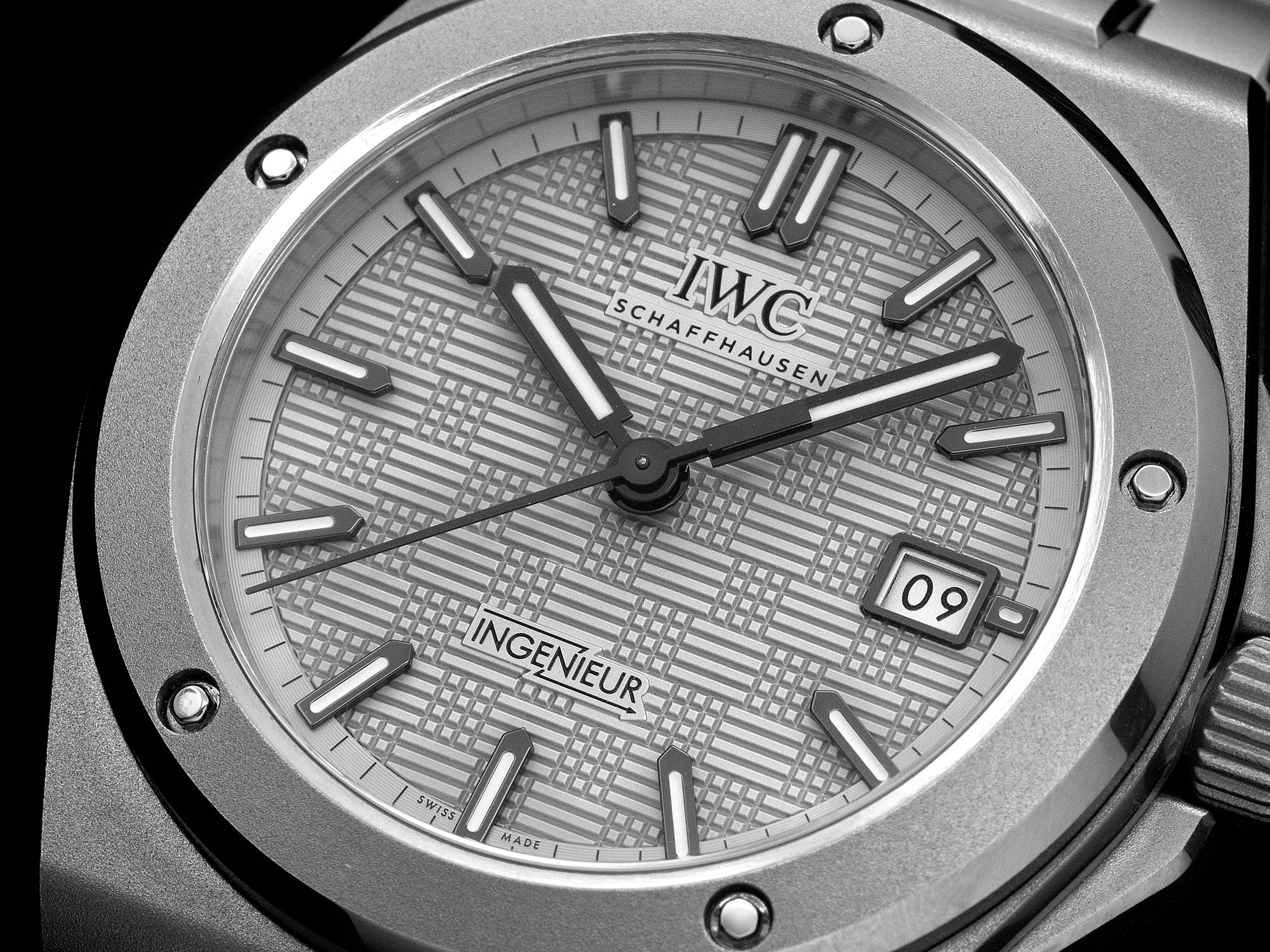 The gray dial features the same intersecting grid pattern seen in the original Ingenieur SL, presenting a multi-dimensional effect. The dial layout is simple with large hour, minute, and second hands, and the markers evoke the design from the 1970s, offering excellent legibility while maintaining a discreet style. The date window is at 3 o’clock, and the iconic “INGENIEUR” logo appears at 6 o’clock.