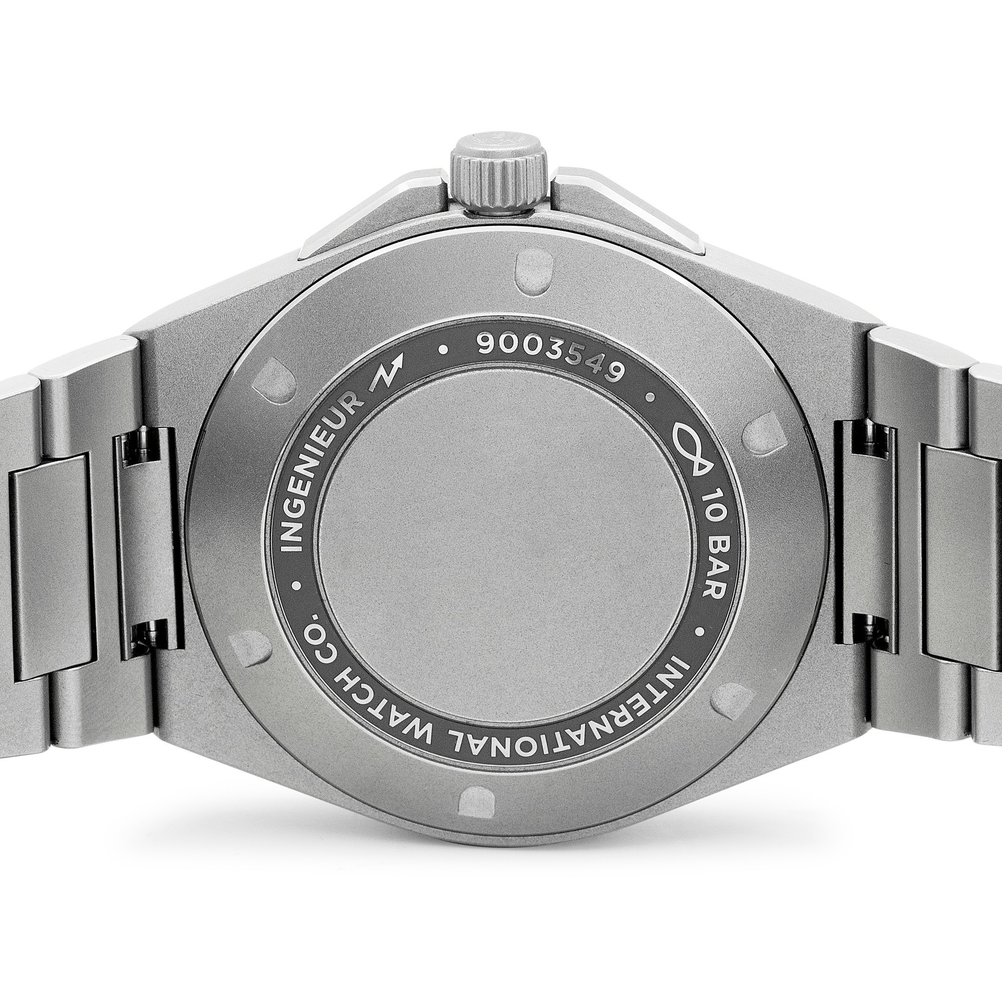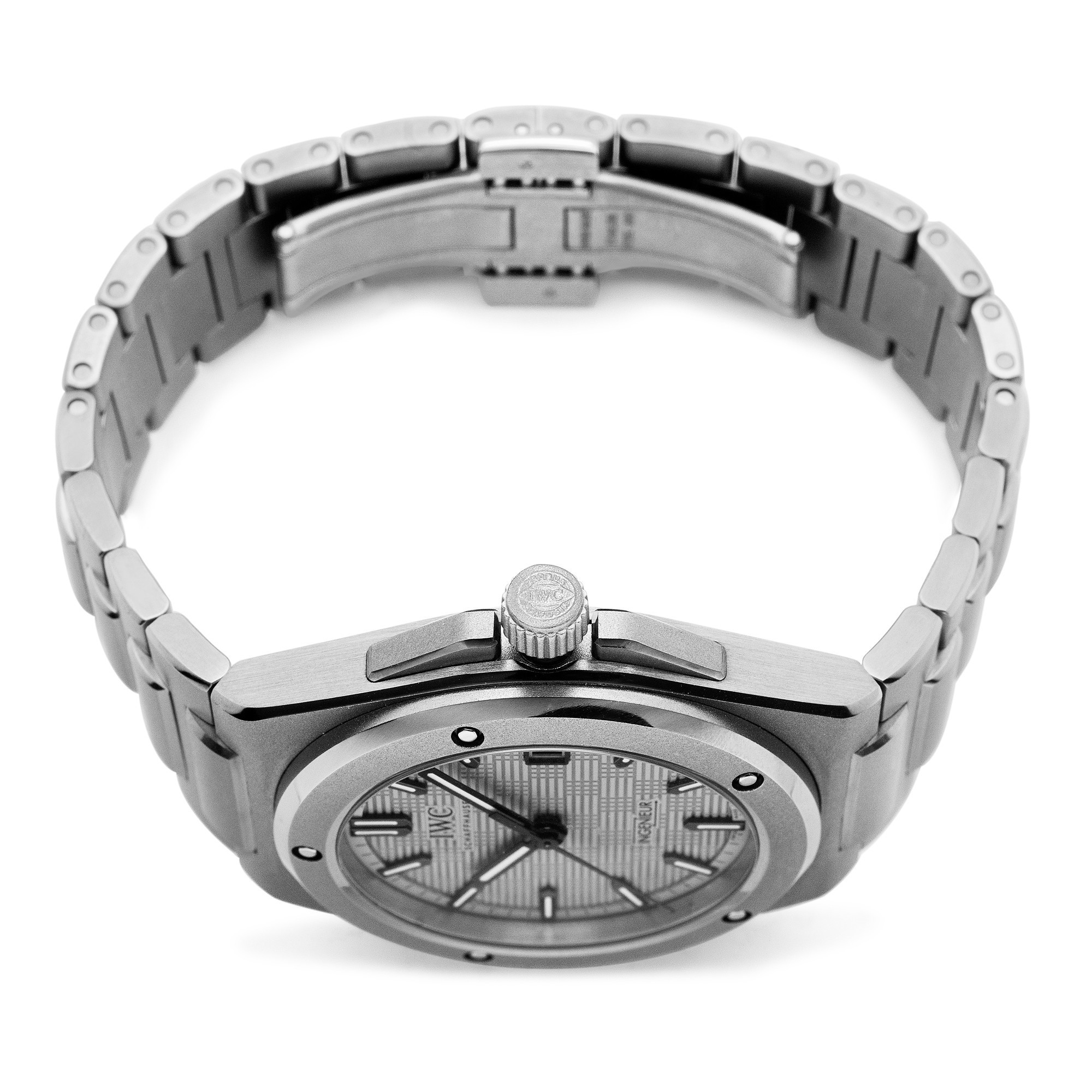 Titanium case, 40mm diameter, 10.7mm thickness, titanium bezel, screw-down crown, sapphire crystal, gray grid-patterned dial, black hands, IWC 32111 automatic movement, 21 jewels, 28,800 vibrations per hour, 5-day power reserve, titanium bracelet, butterfly clasp, 100 meters water resistance.