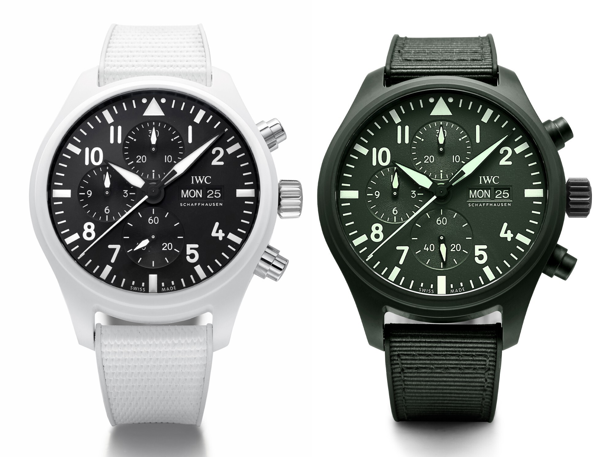 Both new models are powered by the in-house IWC-manufactured Caliber 69380 self-winding movement, beating at 28,800 vibrations per hour and offering a 46-hour power reserve. A soft-iron inner case provides protection against magnetic fields, while the specially reinforced sapphire crystal can withstand sudden pressure changes. Water resistance is 60 meters. The case back is engraved with the classic “TOP GUN” logo.