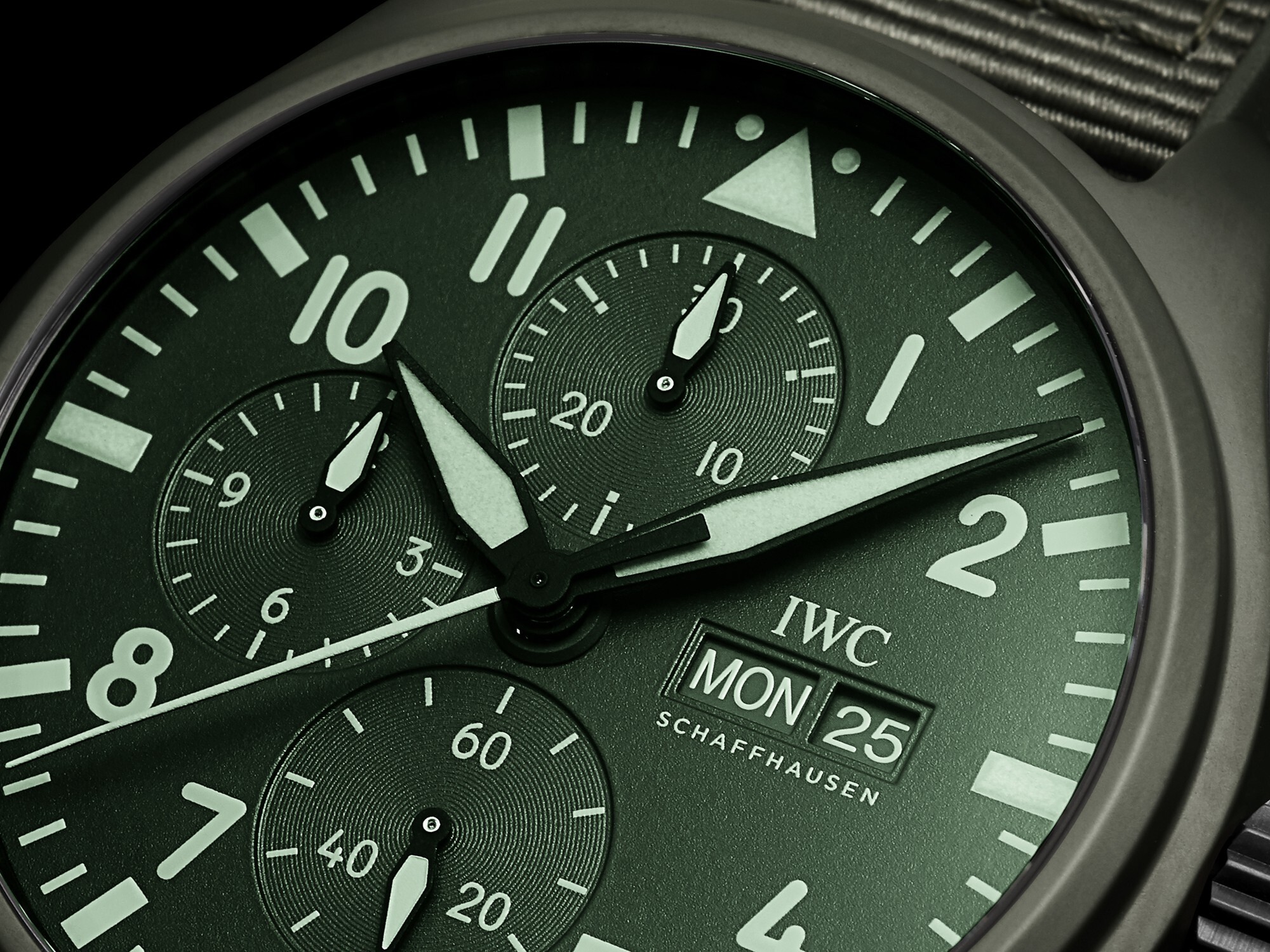 During the 2022 Watches & Wonders exhibition, IWC launched two new TOP GUN chronograph models in its Pilot’s Watch collection, both featuring 44.5mm colored ceramic cases. One features a white ceramic case inspired by the snow-capped mountains of Lake Tahoe in winter, while the other adopts a “Forest Green” color scheme, offering a low-key yet highly distinctive appearance.