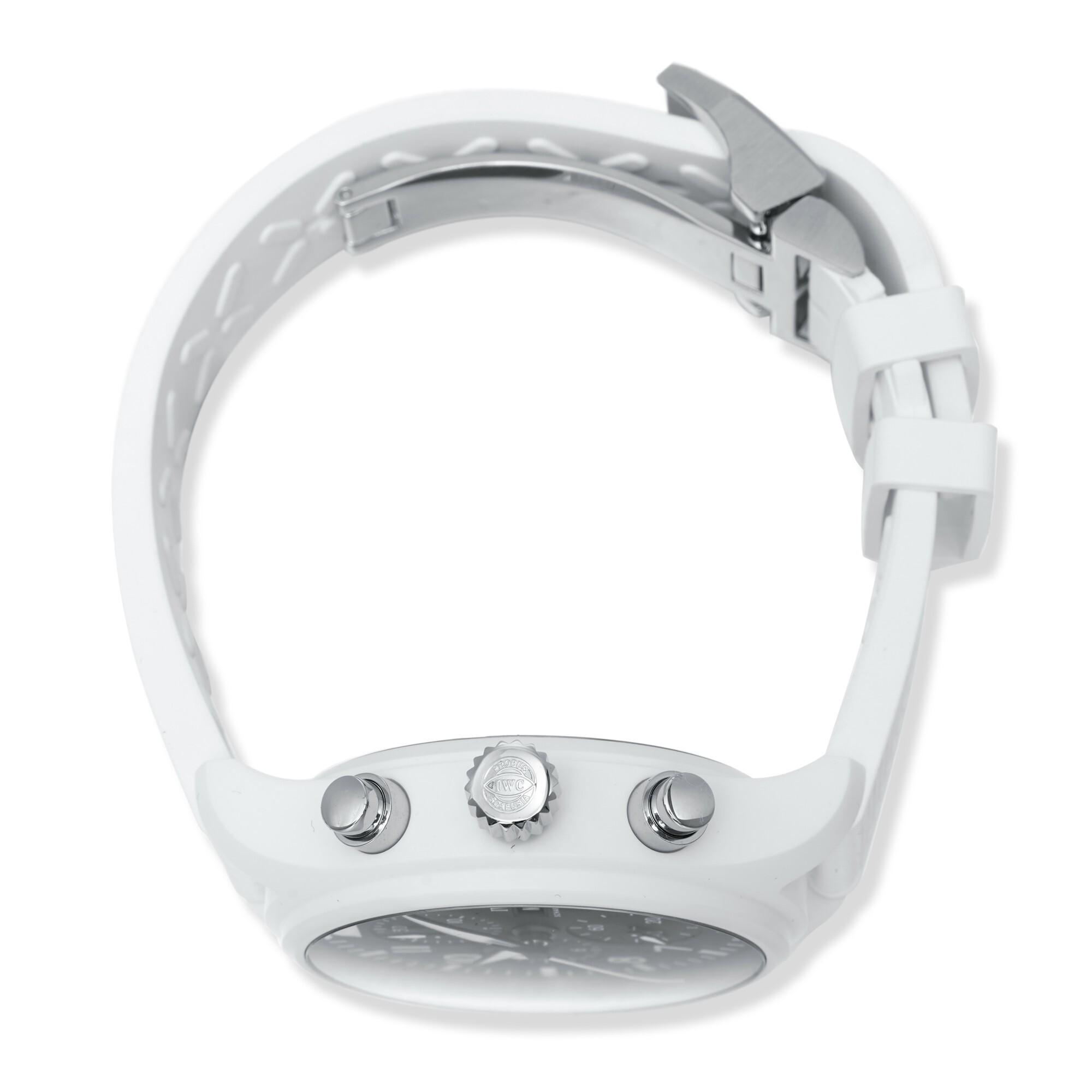 White ceramic case, diameter 44.5mm, thickness 15.7mm,Stainless steel crown, sapphire crystal,Black dial with luminescent hands,IWC Caliber 69380 automatic movement, 33 jewels,28,800 vph, 46-hour power reserve,White rubber strap with folding clasp,Water-resistant to 60 meters.