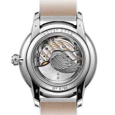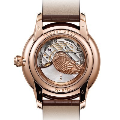Through the sapphire case back, the movement reveals bridges shaped like the outspread wings of the bird, harmoniously paired with mother-of-pearl to create a poetic and imaginative motif. Every polished component reflects the same graceful curvature, underscoring Jaquet Droz’s devotion to detail.