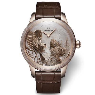 • Movement: Jaquet Droz 2653 self-winding mechanical calibre, twin barrels, 28 jewels, frequency 28,800 vph