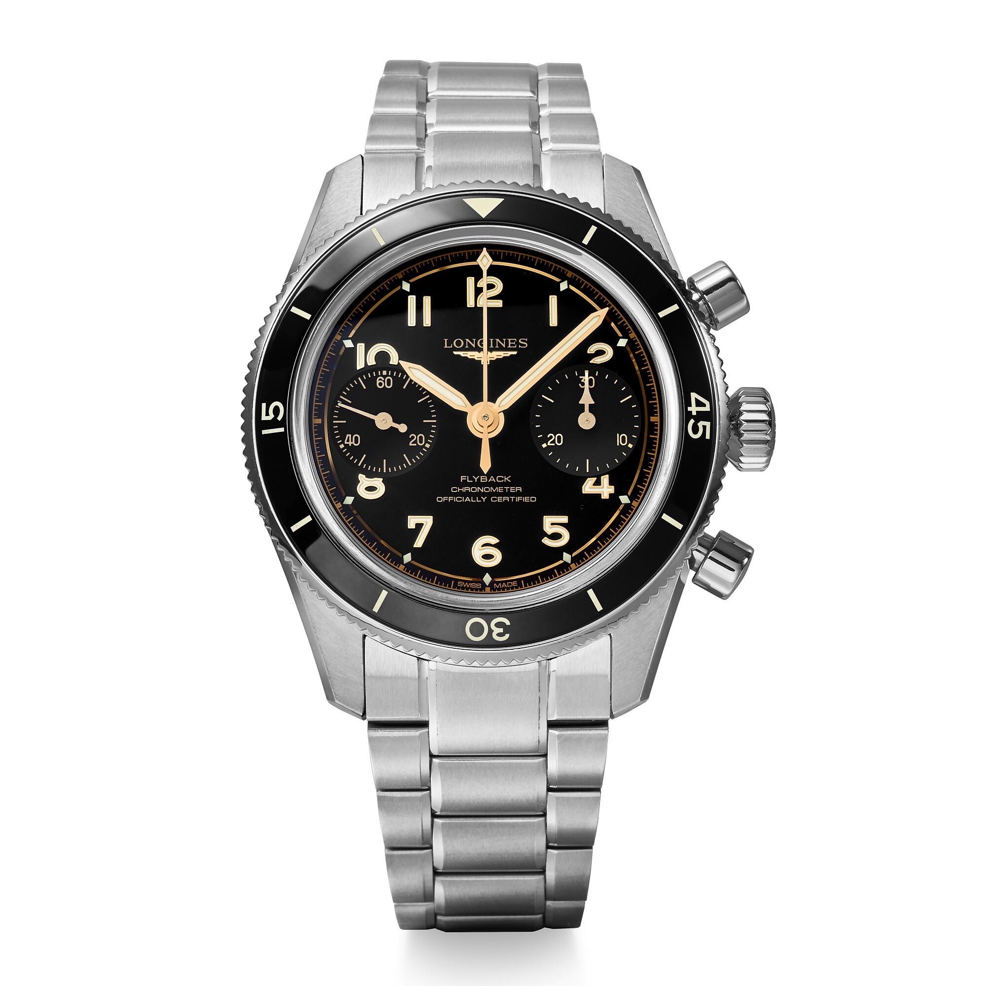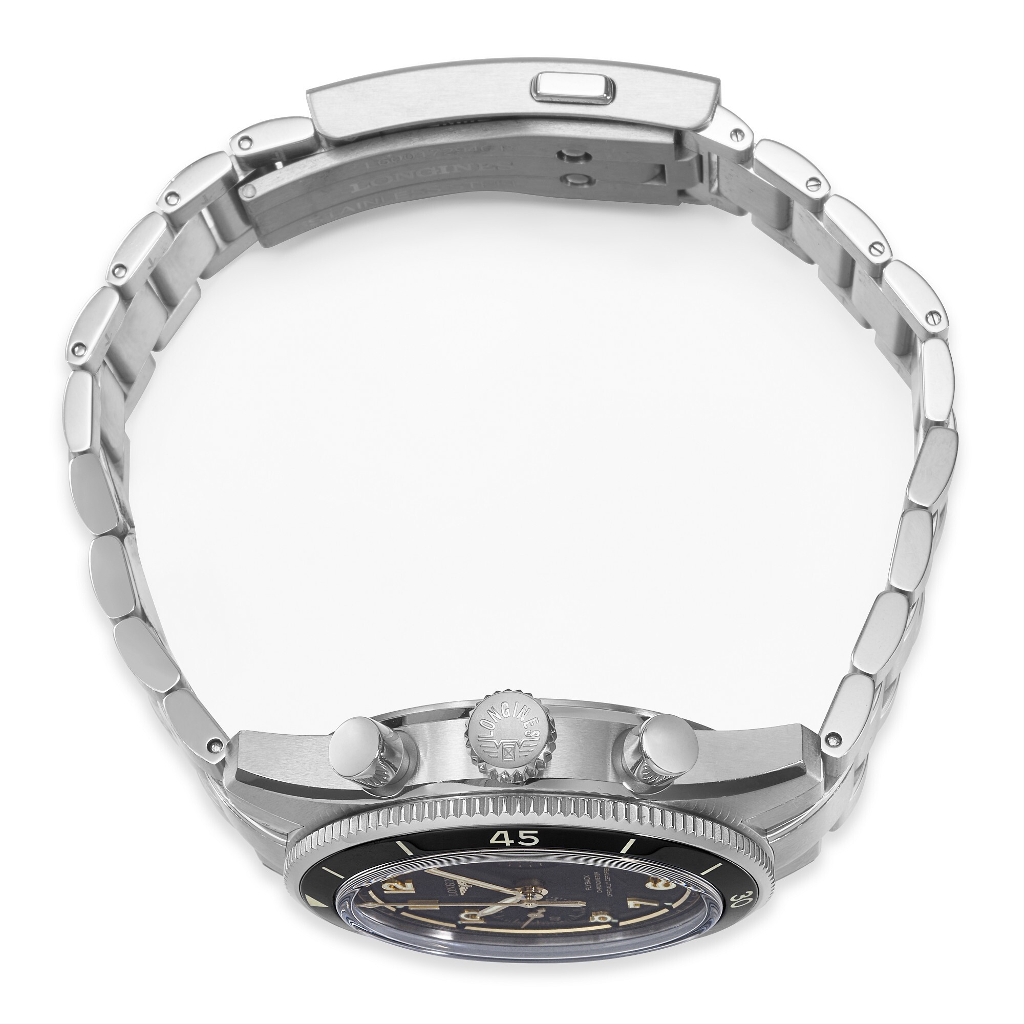 Stainless steel case, 39.5mm diameter, 13.4mm thickness, bidirectional rotating ceramic bezel, stainless steel crown, sapphire crystal, black dial, gilt hands, L792.4 manual-winding movement, 28,800 vph, 68-hour power reserve, stainless steel bracelet, folding clasp, 100m water resistance.