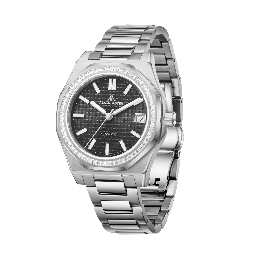 The 39.5mm stainless steel case is treated with alternating satin-brushing and mirror polishing, enhancing the definition of its lines through light and shadow contrast. The black ceramic bidirectional rotating bezel introduces, for the first time, dive-style countdown markers (“15”, “30”, “45”). The screw-down crown ensures 100 meters of water resistance for daily use.