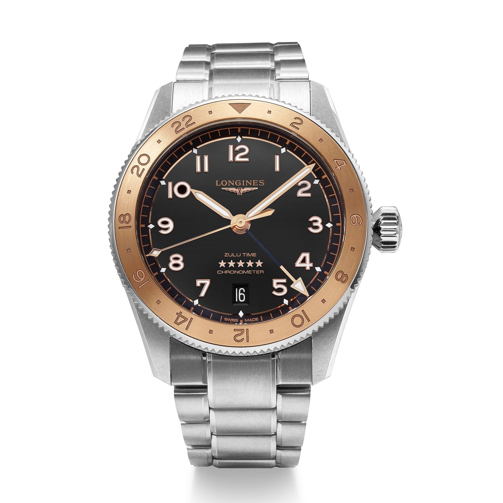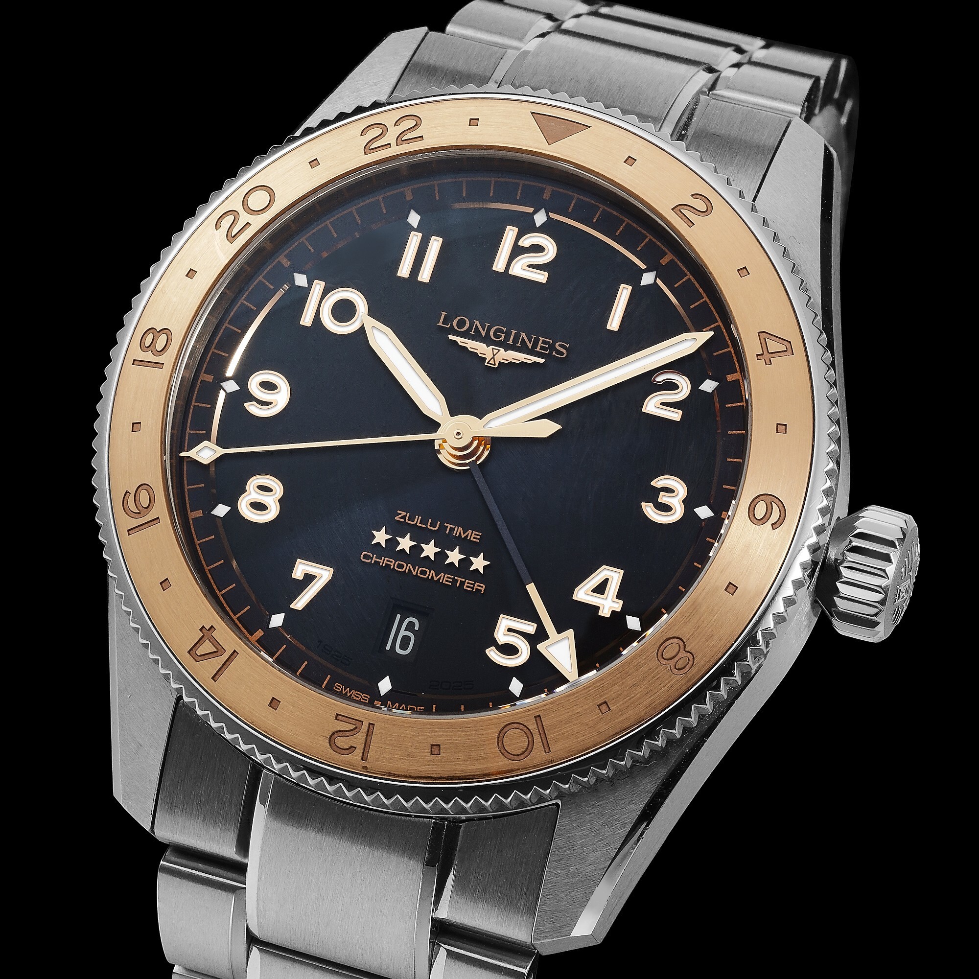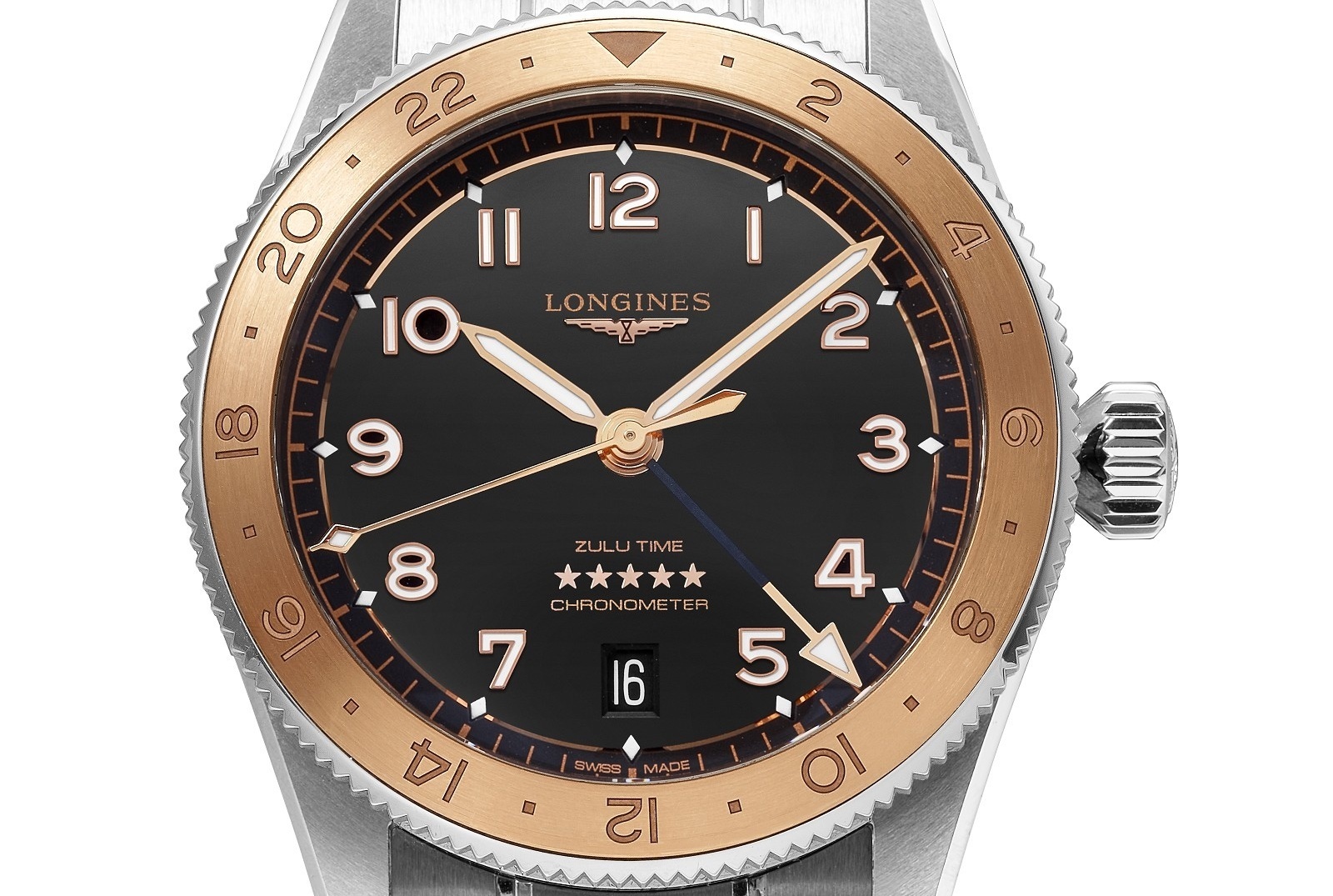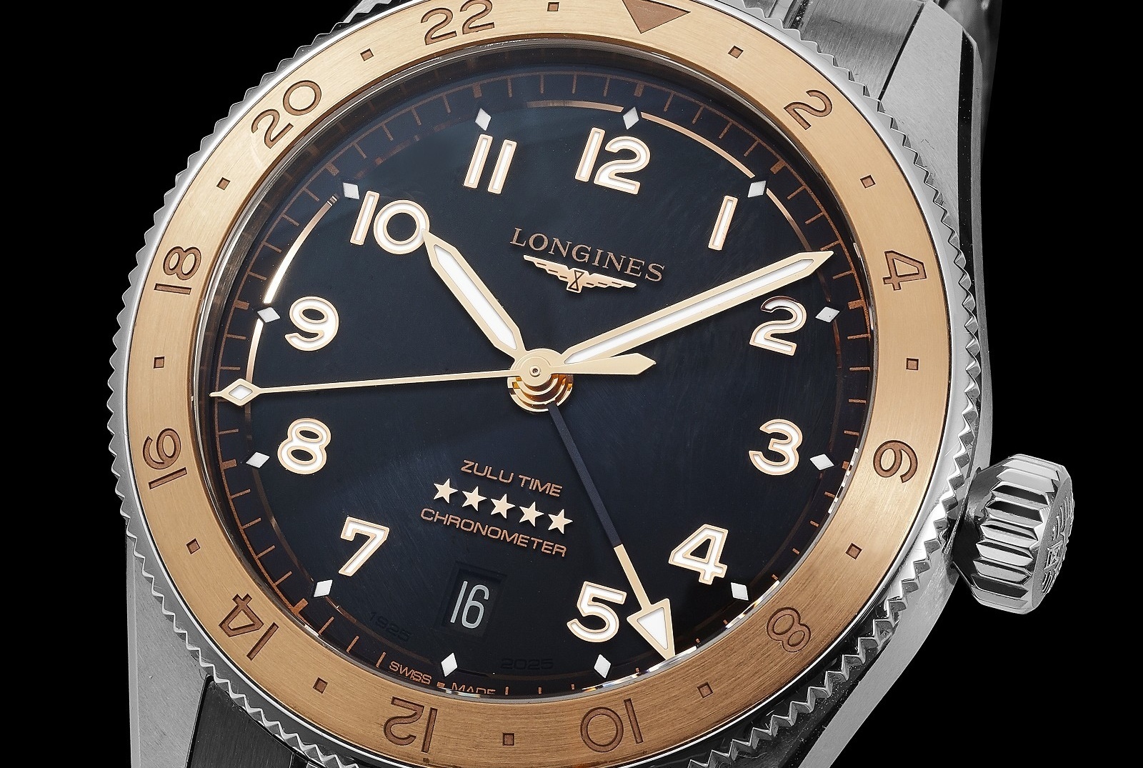 To celebrate the 100th anniversary of its first Zulu Time dual-time watch, Longines presents the Spirit Zulu Time 1925, a special 2025 edition that debuts a rose-gold and stainless-steel two-tone design. The warm gold bezel contrasts strikingly with the matte black dial, achieving a look that is both refined and timeless.