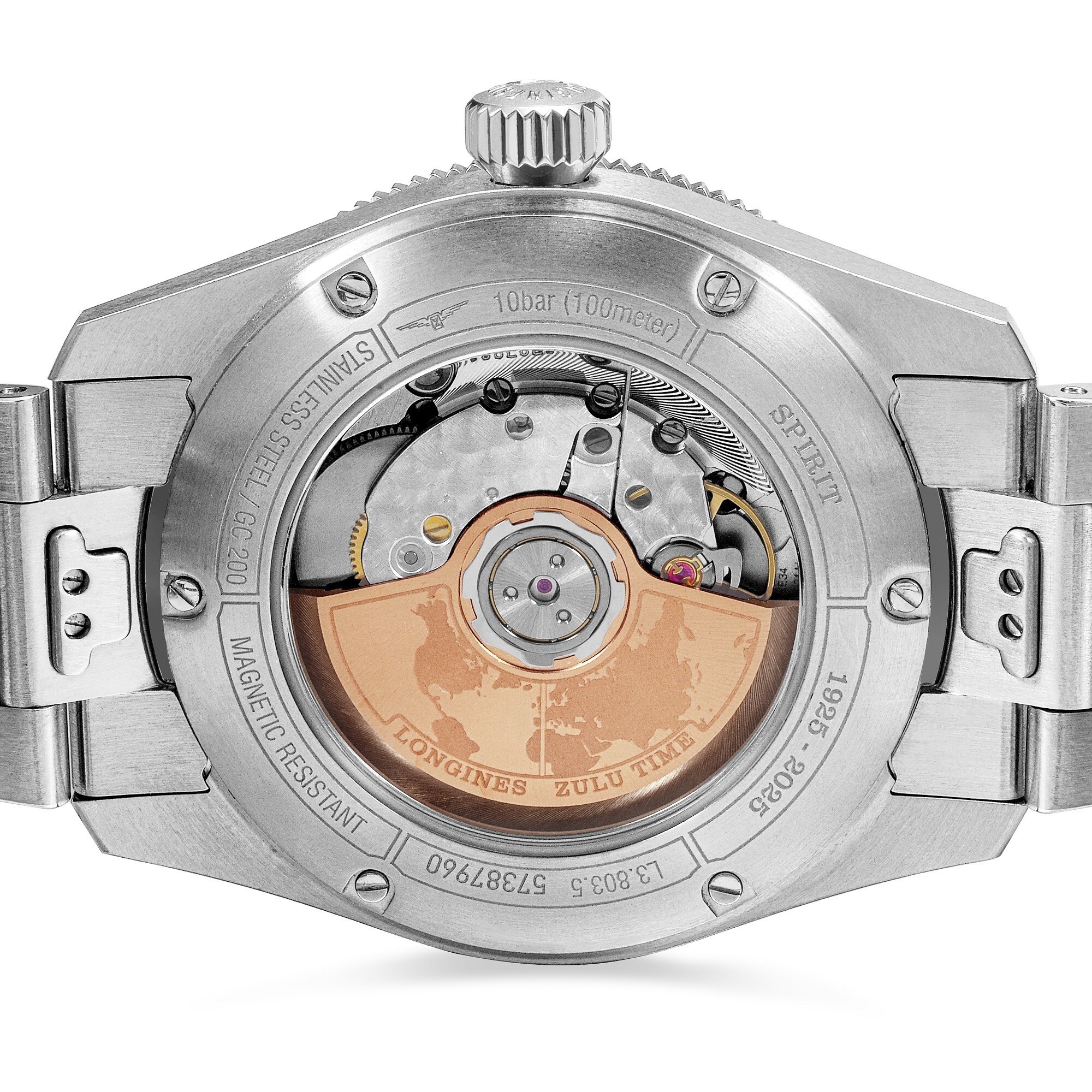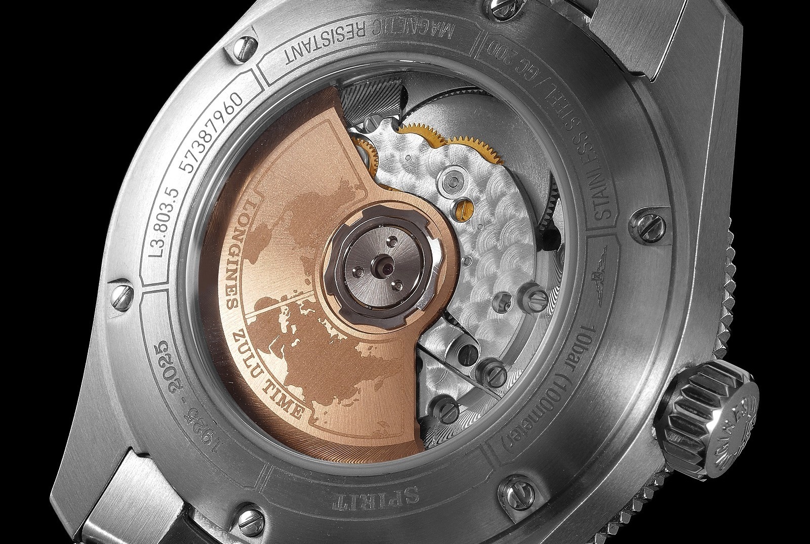 Powering the watch is the COSC-certified Calibre L844.4 automatic movement, beating at 25,200 vibrations per hour with a 72-hour power reserve. The rotor, finished in rose-gold PVD coating, is laser-engraved with a world map centered on the Prime Meridian, symbolizing global standard time — the origin of “Zulu Time.”