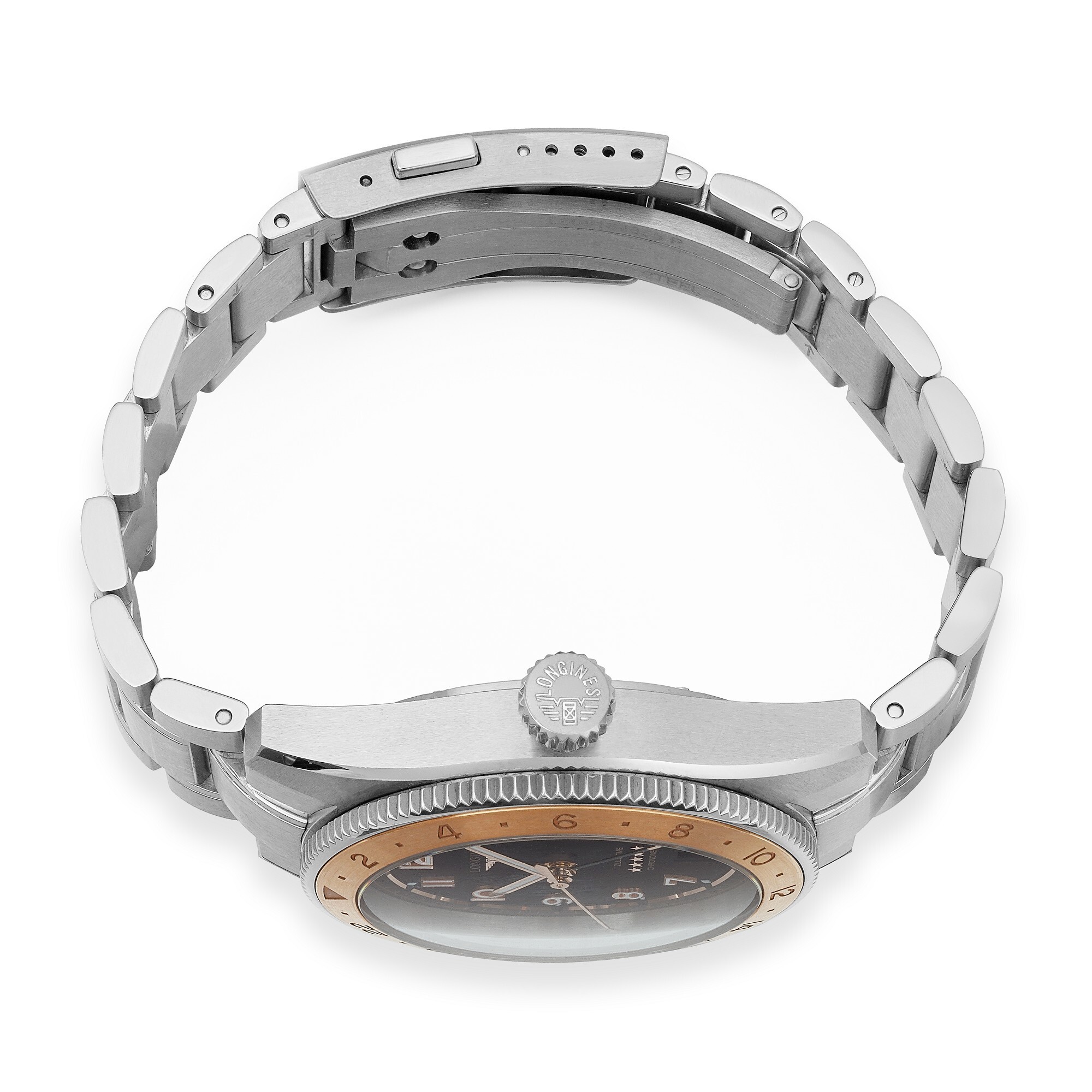 The watch comes fitted with a stainless-steel bracelet and is supplied with an additional black NATO strap. The official retail price ist €4,500 Longines Spirit Zulu Time 1925 Bi-Color GMT Watch Stainless-steel case, 39 mm diameter, 13.5 mm thickness, 18K rose-gold and stainless-steel bezel, stainless-steel crown, sapphire crystal, matte black dial, rose-gold-edged hands, Calibre L844.4 automatic movement, 25,200 vph, 72-hour power reserve, stainless-steel bracelet with folding safety clasp, 100 m water resistance. Complication: GMT (dual time)