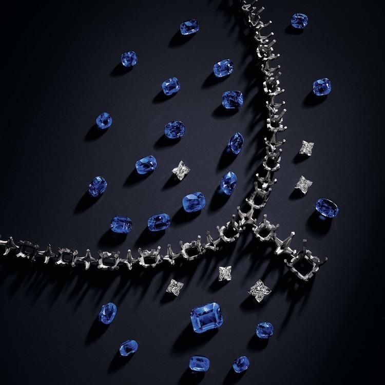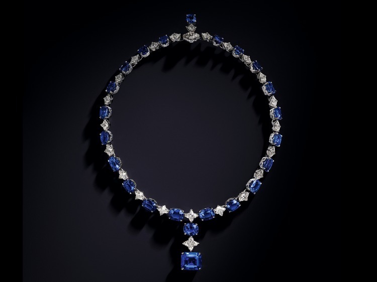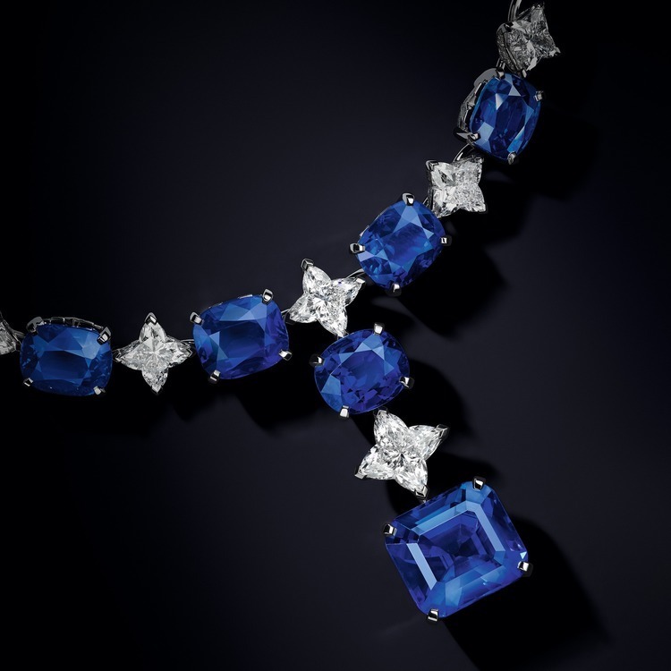Kashmir sapphires are the rarest and most precious variety by origin, with only a handful appearing on the open market each year; stones over 10 carats are typically seen only in global annual colored gemstone rankings. This Louis Vuitton Aster necklace assembles 23 large Kashmir sapphires with a total weight of 125 carats, perfectly matched in color, cut, and crystal transparency. The process of collecting these gems alone took 20 years.