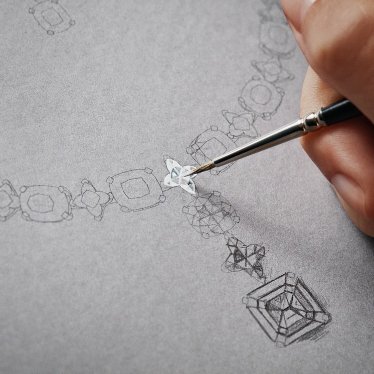 The necklace took 6 months from design to completion, with a total of over 1,500 hours of work. It features a flexible articulated structure with nearly invisible connecting links. The setting for each gem is flawless, using openwork mounts carved with a “V” shape on the sides to maximize light penetration from every angle. Furthermore, the necklace’s clasp is itself a work of art, cleverly depicting a diamond Monogram star motif, set with custom-cut diamonds and four kite-cut diamonds.