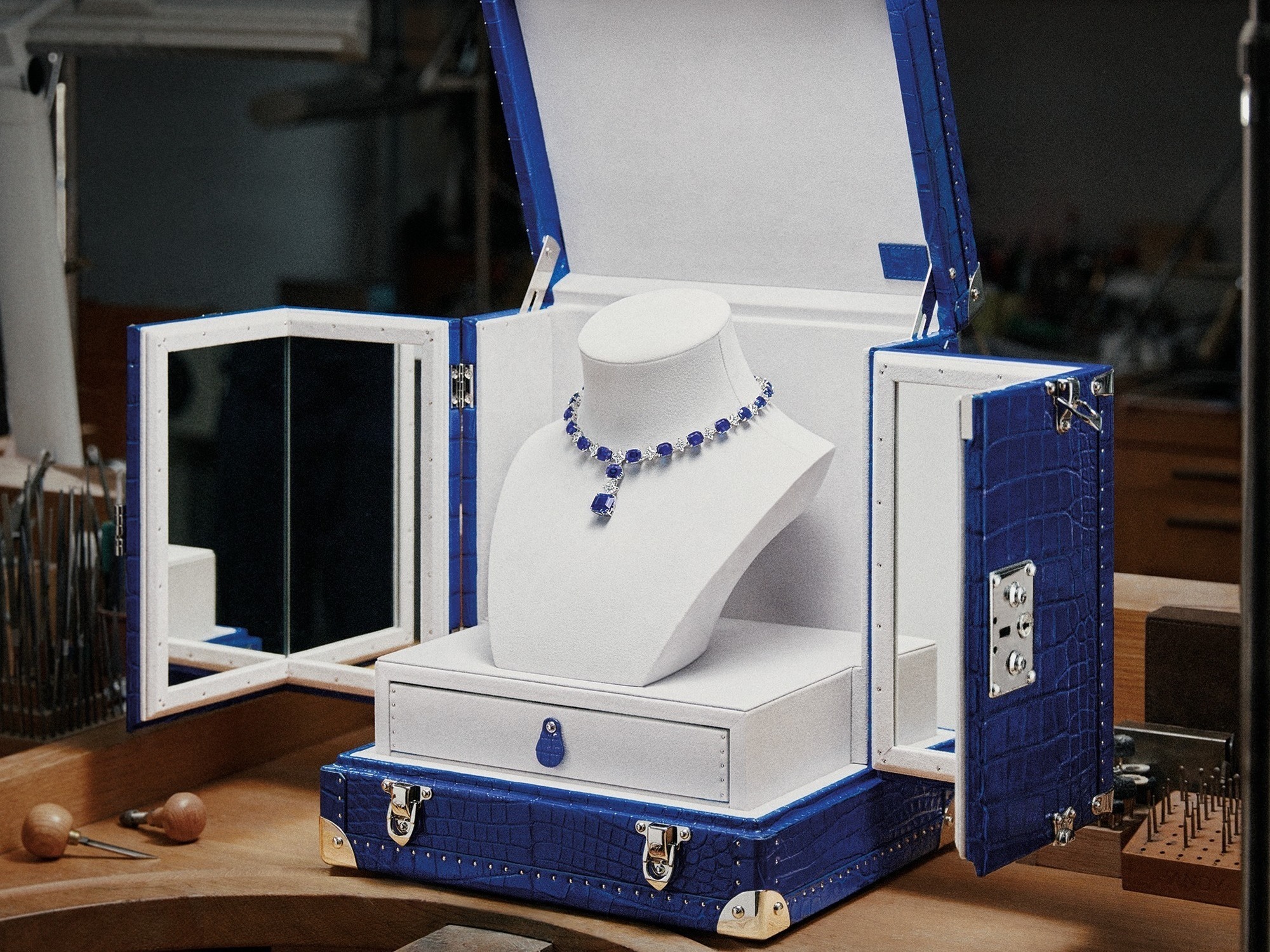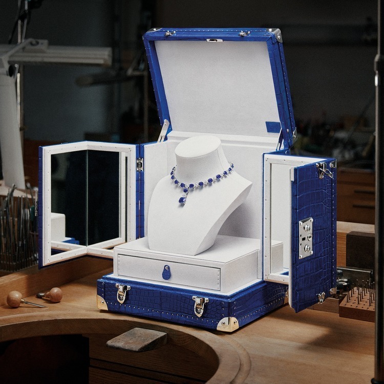 It is worth noting that Louis Vuitton created a custom-designed case exclusively for this Aster High Jewelry necklace. This special case was made in the Asnières-sur-Seine workshop. The body is crafted from blue crocodile leather, its color inspiration undoubtedly drawn from the Kashmir sapphires adorning the necklace. The case opens from the front with double doors; mirrors on the inside of both lids allow you to admire this breathtaking piece from any angle.