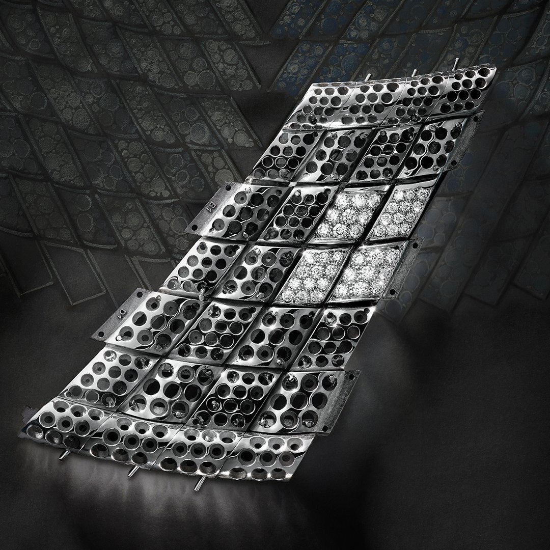 Crafted in white gold, the necklace features an intricate interplay of brilliant-cut diamonds forming layered, interlocking “V” shapes. The progressive depth of the design symbolizes the rapid advancement of industrialization while simultaneously highlighting the brand’s iconic initial. The piece required an extraordinary 2,733 hours to complete.