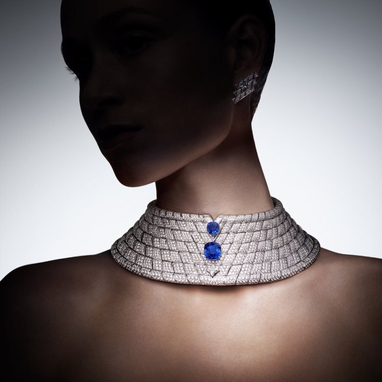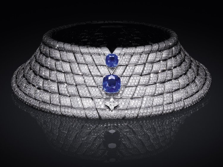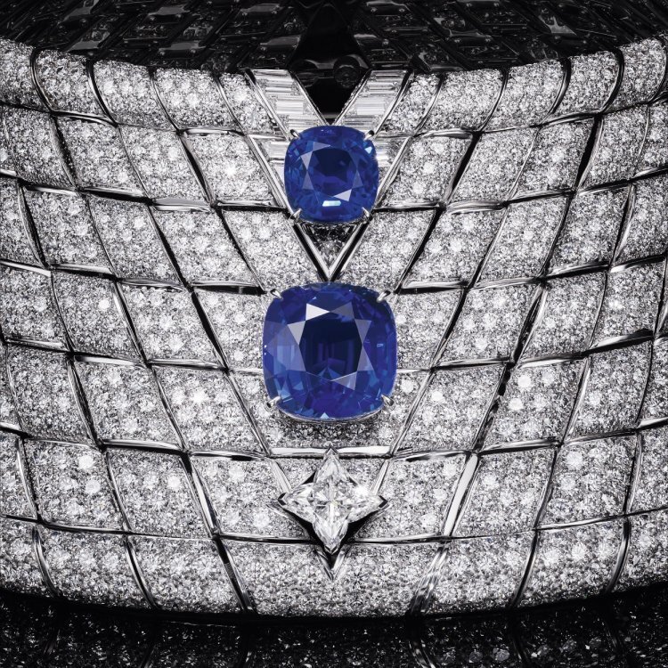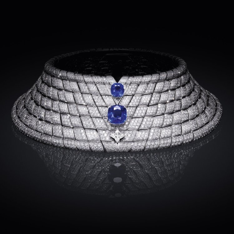 At the center of the necklace, three perfectly cut gemstones are set in vertical alignment: a 7.08-carat cushion-cut sapphire from Madagascar, a 20.10-carat cushion-cut sapphire from Sri Lanka—both of exceptional quality and velvety blue hue—and finally, a 2.51-carat LV Monogram Star-cut diamond graded D color and IF clarity, serving as the brilliant focal point of the creation.