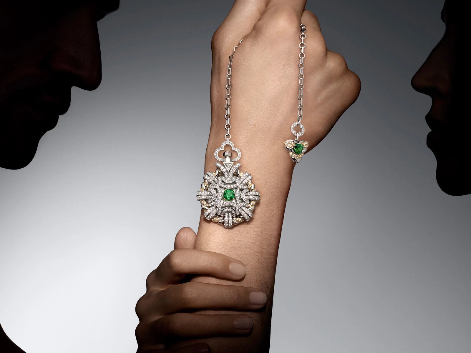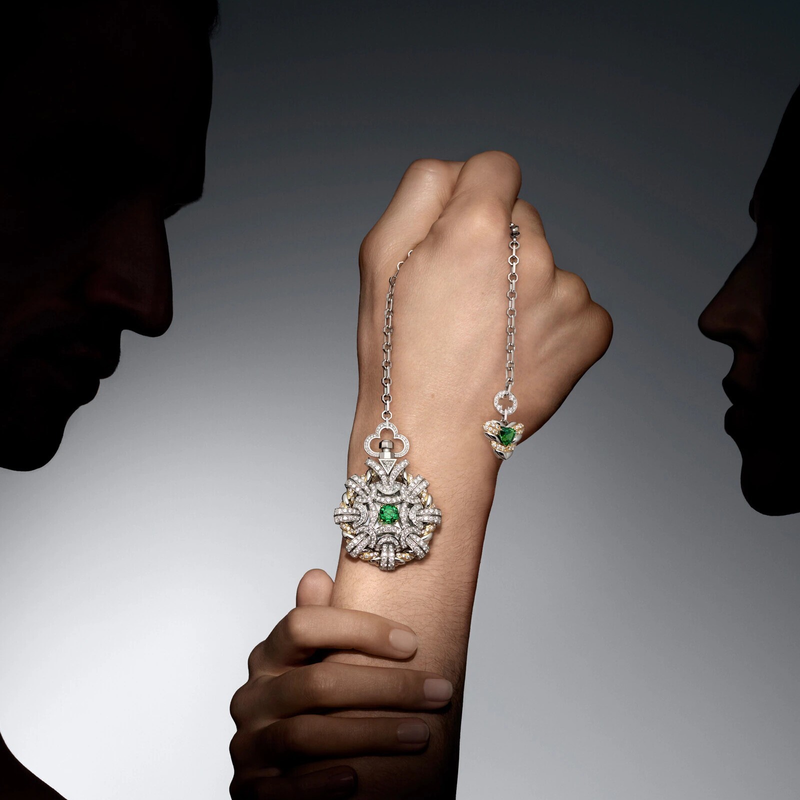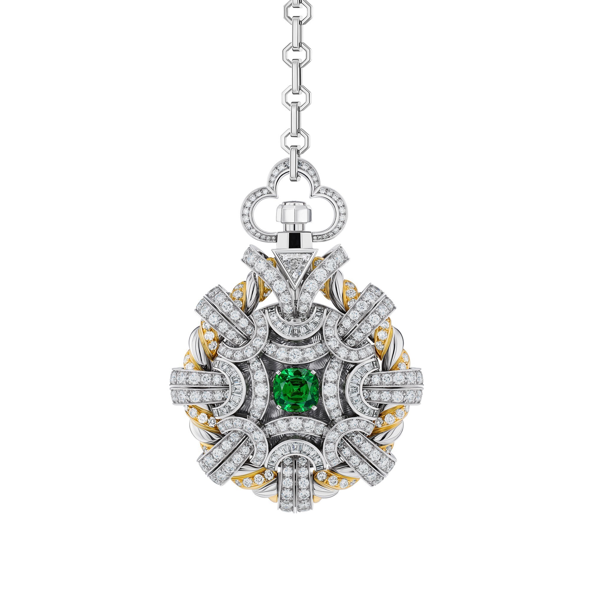 The highlight of the design is the gemstone’s seemingly “suspended” setting at the center of the cover—an illusion of levitation that enhances the stone’s luminous depth. Completing the composition, a 2.16-carat triangular-cut tsavorite is set as a pendant at the end of the chain, echoing the main gem with dynamic visual harmony during wear.